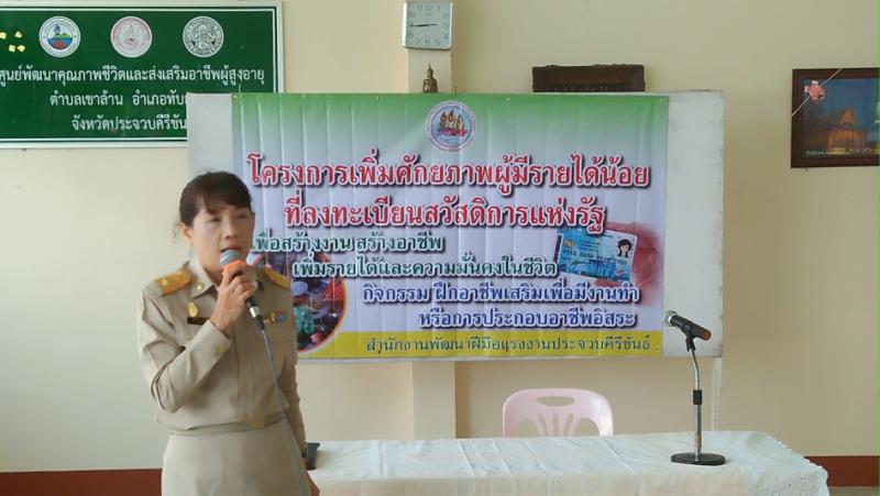 วันที่ 9 กรกฎาคม 2561 เวลา 09.00 น. นางสาวกรจิรัฏฐ์ พงจันทร์ศธร แรงงานจังหวัดประจวบคีรีขันธ์ พร้อมด้วยนางสาวกอบกุล มะลิวัลย์ ผู้อำนวยการสำนักงานพัฒนาฝีมือแรงงานประจวบคีรีขันธ์ และผู้แทนหน่วยงานสังกัดกระทรวงแรงงาน ร่วมบรรยายสรุปภารกิจการให้บริการของหน่วยงานสังกัดกระทรวงแรงงาน ให้แก่ผู้รับการฝึกอบรมตามโครงการเพิ่มศักยภาพผู้มีรายได้น้อยที่ลงทะเบียนสวัสดิการแห่งรัฐ เพื่อสร้างงาน สร้างอาชีพ เพิ่มรายได้ และความมั่นคงในชีวิต สาขา การทำขนมไทย ณ องค์การบริหารส่วนตำบลเขาล้าน ตำบลเขาล้าน อำเภอทับสะแก จังหวัดประจวบคีรีขันธ์ โดยการฝึกทักษะอาชีพให้แก่ผู้มีรายได้น้อยที่ลงทะเบียนสวัสดิการแห่งรัฐ ที่มีรายได้ต่ำกว่า 30,000 บาท ในเขตพื้นที่อำเภอทับสะแก จังหวัดประจวบคีรีขันธ์