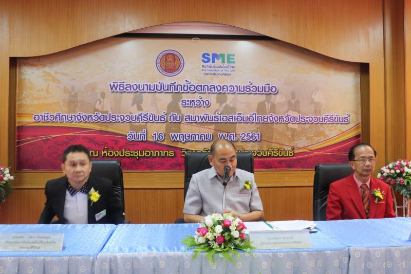 วันที่ 16 พฤษภาคม 2561 เวลา 09.30 น. นางสาวกรจิรัฏฐ์ พงจันทร์ศธร แรงงานจังหวัดประจวบคีรีขันธ์ ร่วมเป็นเกียรติและเป็นสักขีพยานในพิธีลงนามบันทึกข้อตกลงความร่วมมือ ระหว่างสมาพันธ์ SME ไทย จังหวัดประจวบคีรีขันธ์และอาชีวศึกษาจังหวัดประจวบคีรีขันธ์ เพื่อสนับสนุนส่งเสริมและพัฒนาศักยภาพผู้ประกอบการ SME ของจังหวัดประจวบคีรีขันธ์ในทุกมิติ ให้สามารถขับเคลื่อนเศรษฐกิจฐานรากของจังหวัดประจวบคีรีขันธ์ สู่ไทยแลนด์ 4.0 อย่างมั่นคง มั่งคั่งและยั่งยืน ในการนี้มี นายพัลลภ สิงหเสนี ผู้ว่าราชการจังหวัดประจวบคีรีขันธ์ เป็นประธานโครงการดังกล่าว ณ ห้องอาภากร แผนกพาณิชยการ วิทยาลัยเทคนิคประจวบคีรีขันธ์
