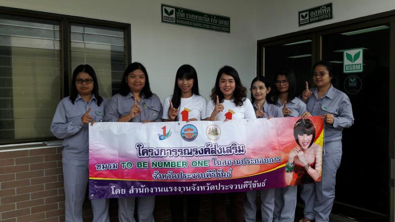วันที่ 5 มิถุนายน 2561 นางสาวกรจิรัฏฐ์ พงจันทร์ศธร แรงงานจังหวัดประจวบคีรีขันธ์ มอบหมายให้นางสาวอังคณา คงศักดิ์ นักวิชาการแรงงานชำนาญการ และ นางสาวพรรณราย ปานเล็ก นักวิชาการแรงงาน เข้ารณรงค์ส่งเสริมการจัดตั้งชมรม TO BE NUMBER ONE และศูนย์เพื่อนใจ TO BE NUMBER ONE ในสถานประกอบการ ในพื้นที่อำเภอเมืองและอำเภอบางสะพาน จังหวัดประจวบคีรีขันธ์ จำนวน 2 แห่ง ได้แก่ (1)บริษัท ทรอปิคอล นูทริชั่น จำกัด อ.เมือง (2) บริษัท บางสะพานบาร์มิล จำกัด (มหาชน) อ.บางสะพาน ทั้งนี้ เจ้าหน้าที่ ได้บรรยายสรุปแนวทางการดำเนินงานตามโครงการฯ ซึ่งผลการรณรงค์ฯ สถานประกอบการส่วนใหญ่ ได้ให้ความสนใจเข้าร่วมในการจัดตั้งชมรมฯ