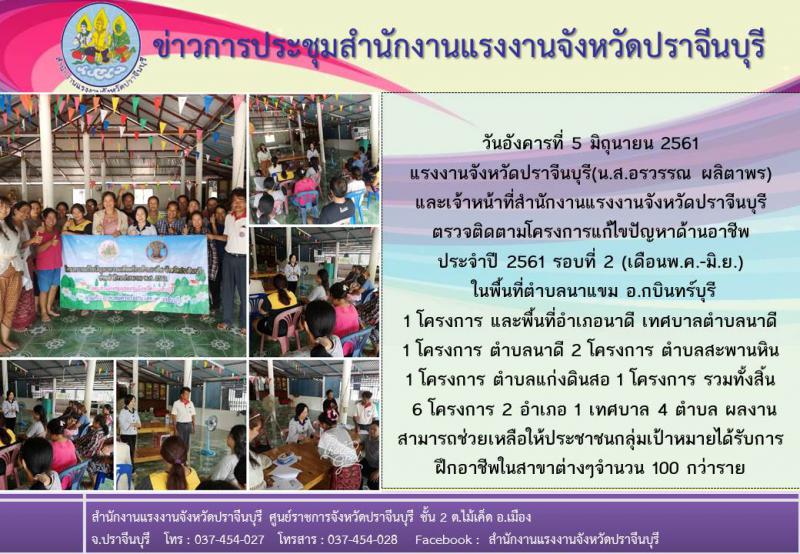 งงานจังหวัดปราจีนบุรี(น.ส.อรวรรณ ผลิตาพร) และเจ้าหน้าที่สำนักงานแรงงานจังหวัดปราจีนบุรีตรวจติดตามโครงการแก้ไขปัญหาด้านอาชีพ ประจำปี2561 รอบที่ 2 (เดือนพ.ค.-มิ.ย.) ในพื้นที่ตำบลนาแขม อ.กบินทร์บุรี 1 โครงการ และพื้นที่อำเภอนาดี เทศบาลตำบลนาดี 1 โครงการ ตำบลนาดี 2 โครงการ ตำบลสะพานหิน 1 โครงการ ตำบลแก่งดินสอ 1 โครงการ รวมทั้งสิ้น 6 โครงการ 2 อำเภอ 1 เทศบาล 4 ตำ