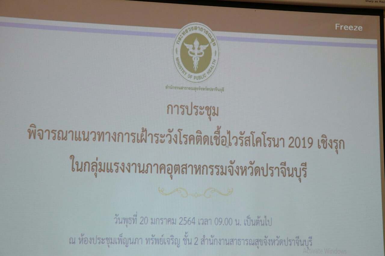วันพุธที่ 20 มกราคม 2564 เวลา 09.00 น. แรงงานจังหวัดปราจีนบุรี (นางชลอศรี บุญแก้วสุข) พร้อมด้วยหัวหน้าส่วนราชการในสังกัดกระทรวงแรงงานจังหวัดปราจีนบุรี ร่วมประชุมพิจารณาแนวทางการเฝ้าระวังโรคติดเชื้อไวรัสโคโรนา 2019 เชิงรุก ในกลุ่มแรงงานภาคอุตสาหกรรมจังหวัดปราจีนบุรี เพื่อให้มีมาตรการ และแนวทางการดำเนินการที่มีความชัดเจน และเป็นไปในทิศทางเดียวกันในภาพรวมของจังหวัดปราจีนบุรี โดยมี นายแพทย์สาธารณสุขจังหวัดปราจีนบุรี (นายแพทย์โชคชัย สาครพานิช) เป็นประธานการประชุม ณ ห้องประชุมเพ็ญนภา ทรัพย์เจริญ ชั้น 2 สำนักงานสาธารณสุขจังหวัดปราจีนบุรี