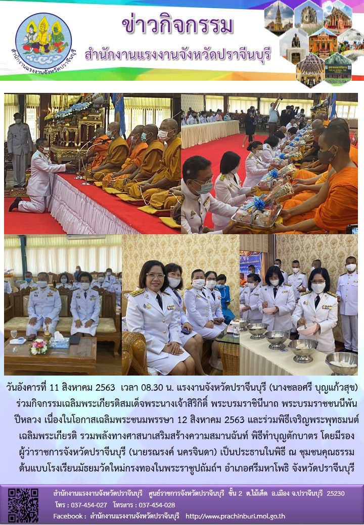 แรงงานจังหวัดปราจีนบุรี ร่วมกิจกรรมเฉลิมพระเกียรติสมเด็จพระนางเจ้าสิริกิติ์ พระบรมราชินีนาถ พระบรมราชชนนีพันปีหลวง เนื่องในโอกาสเฉลิมพระชนมพรรษา 12 สิงหาคม 2563