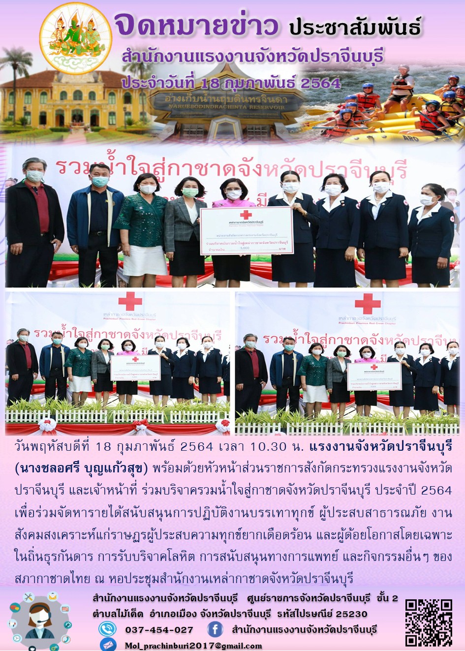 วันพฤหัสบดีที่ 18 กุมภาพันธ์ 2564 เวลา 10.30 น. แรงงานจังหวัดปราจีนบุรี (นางชลอศรี บุญแก้วสุข) พร้อมด้วยหัวหน้าส่วนราชการสังกัดกระทรวงแรงงานจังหวัดปราจีนบุรี และเจ้าหน้าที่ ร่วมบริจาครวมน้ำใจสู่กาชาดจังหวัดปราจีนบุรี ประจำปี 2564 เพื่อร่วมจัดหารายได้สนับสนุนการปฏิบัติงานบรรเทาทุกข์ ผู้ประสบสาธารณภัย งานสังคมสงเคราะห์แก่ราษฏรผู้ประสบความทุกข์ยากเดือดร้อน และผู้ด้อยโอกาสโดยเฉพาะในถิ่นธุรกันดาร การรับบริจาคโลหิต การสนับสนุนทางการแพทย์ และกิจกรรมอื่นๆ ของสภากาชาดไทย ณ หอประชุมสำนักงานเหล่ากาชาดจังหวัดปราจีนบุรี