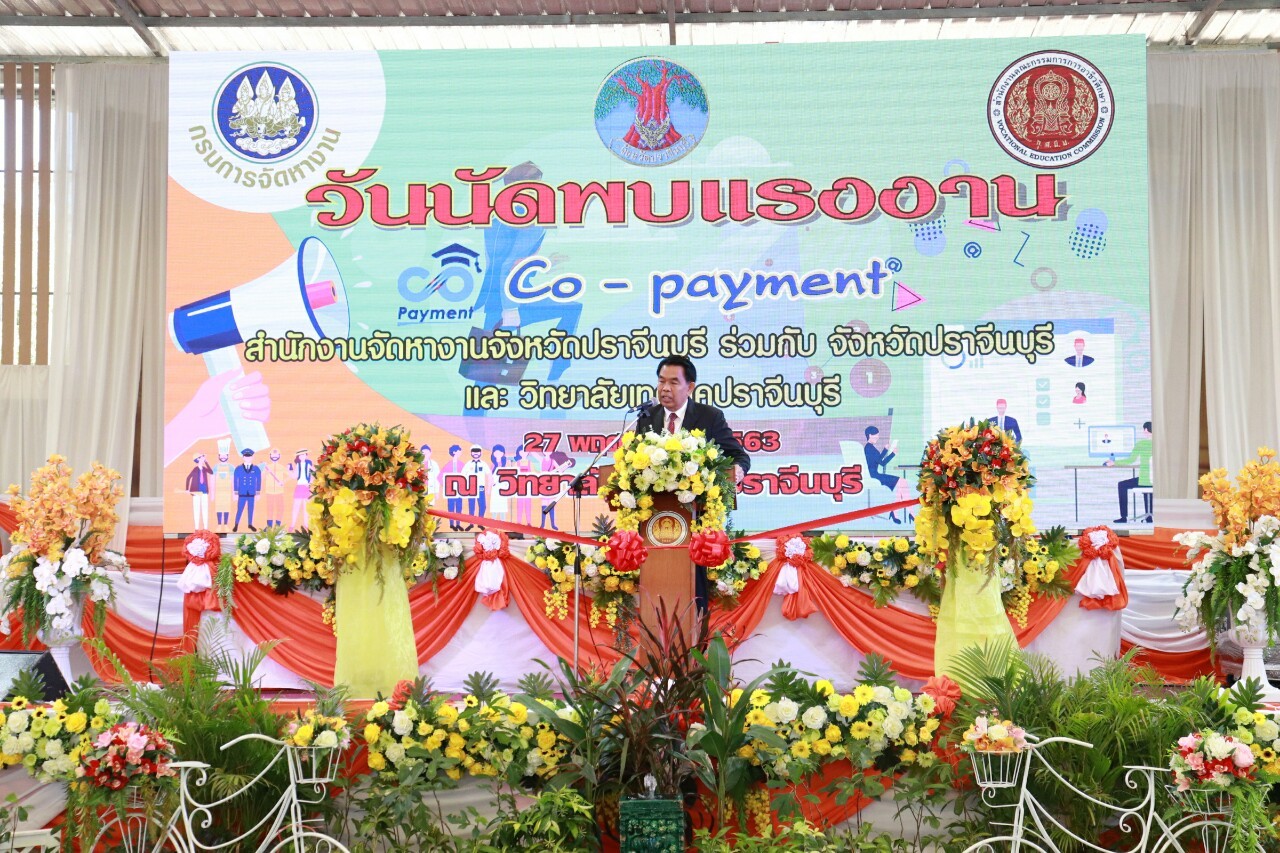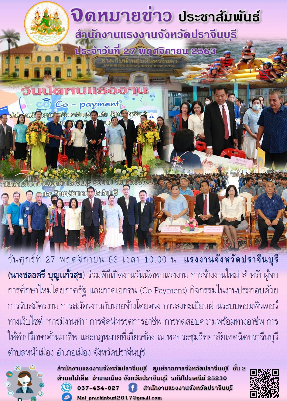 วันศุกร์ที่ 27 พฤศจิกายน 63 เวลา 10.00 น. แรงงานจังหวัดปราจีนบุรี (นางชลอศรี บุญแก้วสุข) ร่วมพิธีเปิดงานวันนัดพบแรงงาน การจ้างงานใหม่ สำหรับผู้จบการศึกษาใหม่โดยภาครัฐ และภาคเอกชน (Co-Payment) กิจกรรมในงานประกอบด้วย การรับสมัครงาน การสมัครงานกับนายจ้างโดยตรง การลงทะเบียนผ่านระบบคอมพิวเตอร์ทางเว็บไซต์ “การมีงานทำ” การจัดนิทรรศการอาชีพ การทดสอบความพร้อมทางอาชีพ การให้คำปรึกษาด้านอาชีพ และกฎหมายที่เกี่ยวข้อง ณ หอประชุมวิทยาลัยเทคนิคปราจีนบุรี ตำบลหน้าเมือง อำเภอเมือง จังหวัดปราจีนบุรี