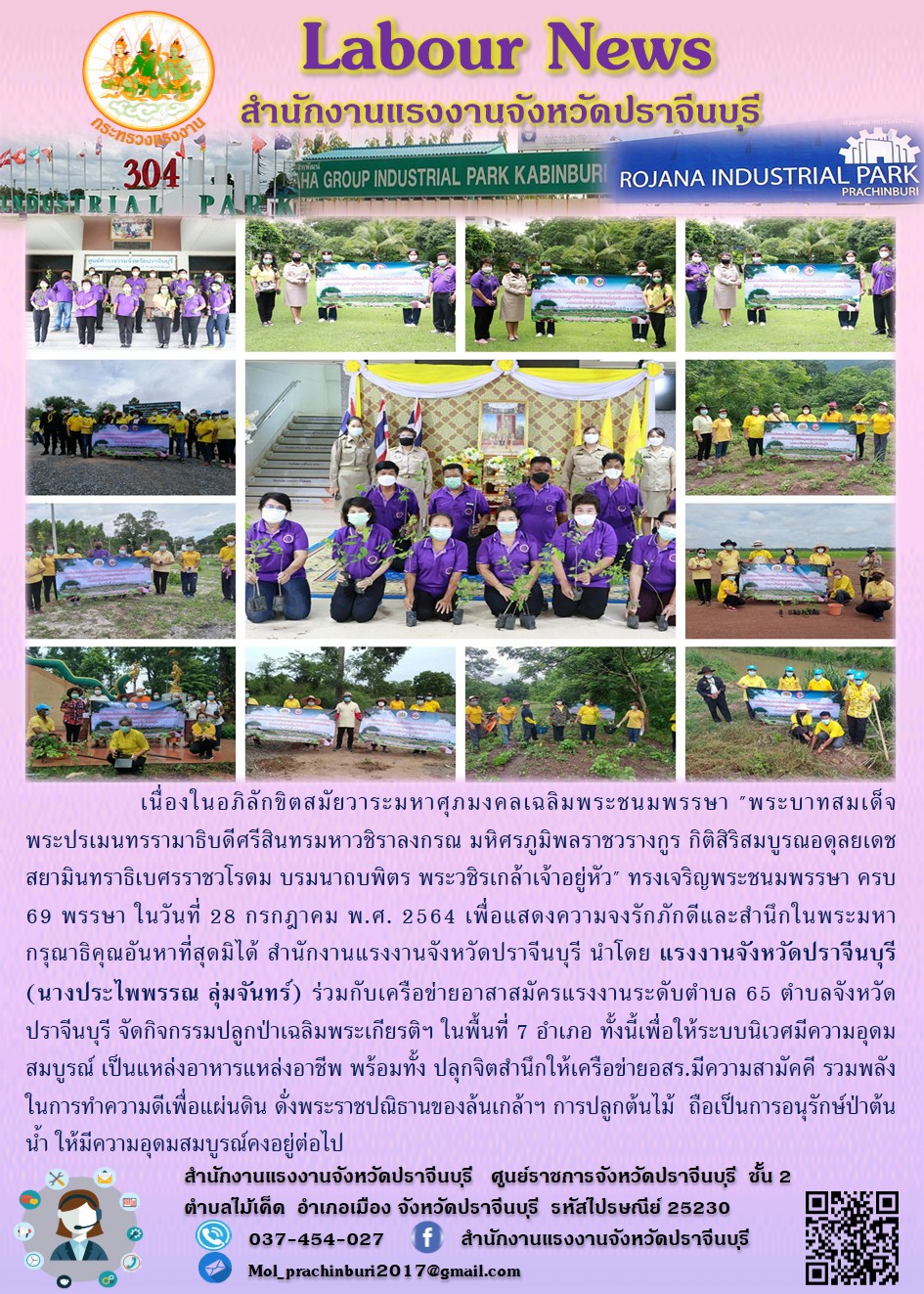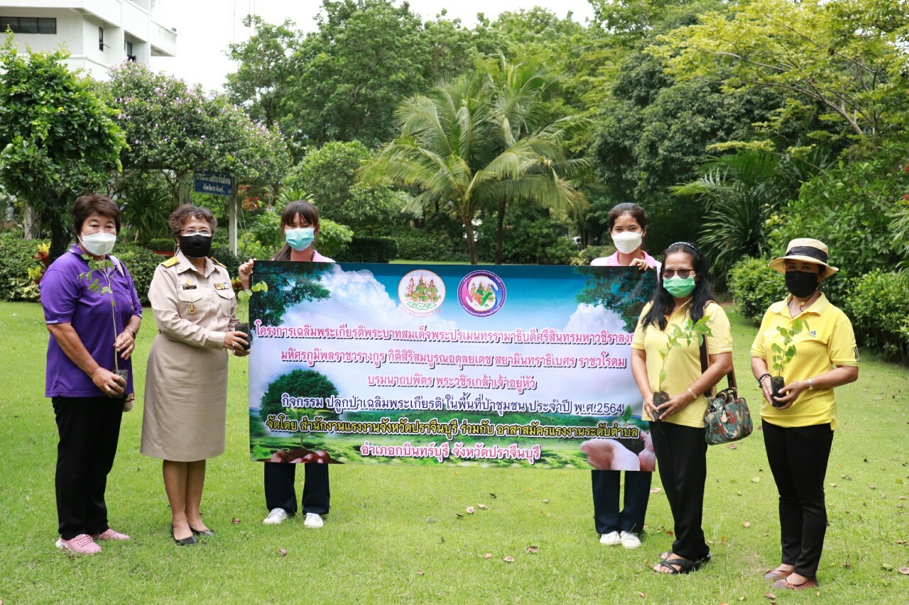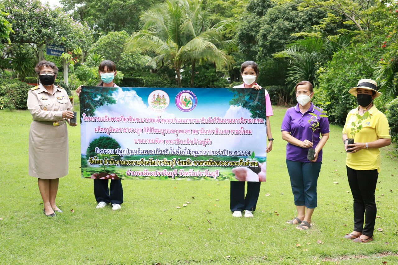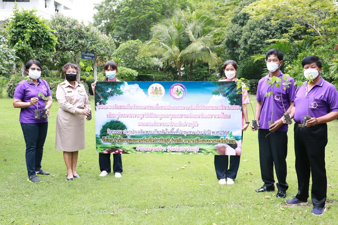 เนื่องในอภิลักขิตสมัยวาระมหาศุภมงคลเฉลิมพระชนมพรรษา “พระบาทสมเด็จ พระปรเมนทรรามาธิบดีศรีสินทรมหาวชิราลงกรณ มหิศรภูมิพลราชวรางกูร กิติสิริสมบูรณอดุลยเดช สยามินทราธิเบศรราชวโรดม บรมนาถบพิตร พระวชิรเกล้าเจ้าอยู่หัว” ทรงเจริญพระชนมพรรษา ครบ 69 พรรษา ในวันที่ 28 กรกฎาคม พ.ศ. 2564 เพื่อแสดงความจงรักภักดีและสำนึกในพระมหากรุณาธิคุณอันหาที่สุดมิได้ สำนักงานแรงงานจังหวัดปราจีนบุรี นำโดย แรงงานจังหวัดปราจีนบุรี (นางประไพพรรณ ลุ่มจันทร์) ร่วมกับเครือข่ายอาสาสมัครแรงงานระดับตำบล 65 ตำบลจังหวัดปราจีนบุรี จัดกิจกรรมปลูกป่าเฉลิมพระเกียรติฯ ในพื้นที่ 7 อำเภอ ทั้งนี้เพื่อให้ระบบนิเวศมีความอุดมสมบูรณ์ เป็นแหล่งอาหารแหล่งอาชีพ พร้อมทั้ง ปลุกจิตสำนึกให้เครือข่ายอสร.มีความสามัคคี รวมพลังในการทำความดีเพื่อแผ่นดิน ดั่งพระราชปณิธานของล้นเกล้าฯ การปลูกต้นไม้ ถือเป็นการอนุรักษ์ป่าต้นน้ำ ให้มีความอุดมสมบูรณ์คงอยู่ต่อไป