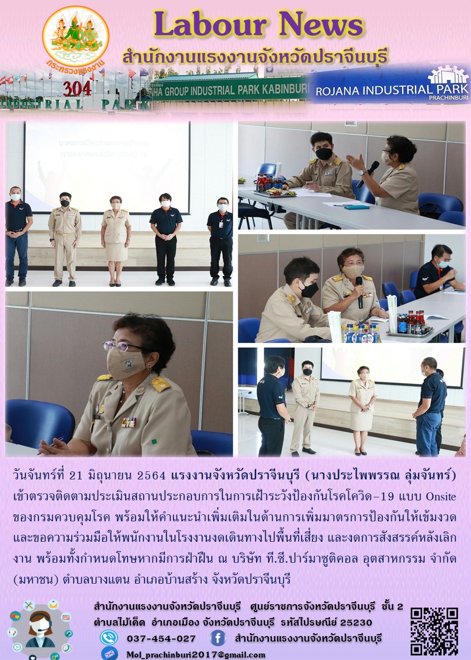 วันจันทร์ที่ 21 มิถุนายน 2564 แรงงานจังหวัดปราจีนบุรี (นางประไพพรรณ ลุ่มจันทร์) เข้าตรวจติดตามประเมินสถานประกอบการในการเฝ้าระวังป้องกันโรคโควิด–19 แบบ Onsite ของกรมควบคุมโรค พร้อมให้คำแนะนำเพิ่มเติมในด้านการเพิ่มมาตรการป้องกันให้เข้มงวด และขอความร่วมมือให้พนักงานในโรงงานงดเดินทางไปพื้นที่เสี่ยง และงดการสังสรรค์หลังเลิกงาน พร้อมทั้งกำหนดโทษหากมีการฝ่าฝืน ณ บริษัท ที.ซี.ปาร์มาซูติคอล อุตสาหกรรม จำกัด (มหาชน) ตำบลบางแตน อำเภอบ้านสร้าง จังหวัดปราจีนบุรี