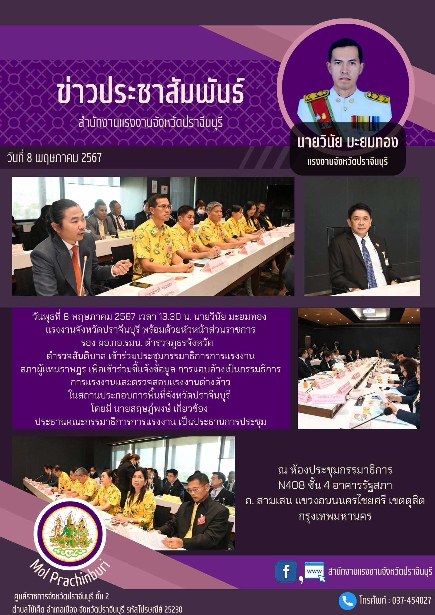 วันพุธที่ 8 พฤษภาคม 2567 เวลา 13.30 น. นายวินัย มะยมทอง แรงงานจังหวัดปราจีนบุรี พร้อมด้วยหัวหน้าส่วนราชการ รอง ผอ.กอ.รมน. ตำรวจภูธรจังหวัด
