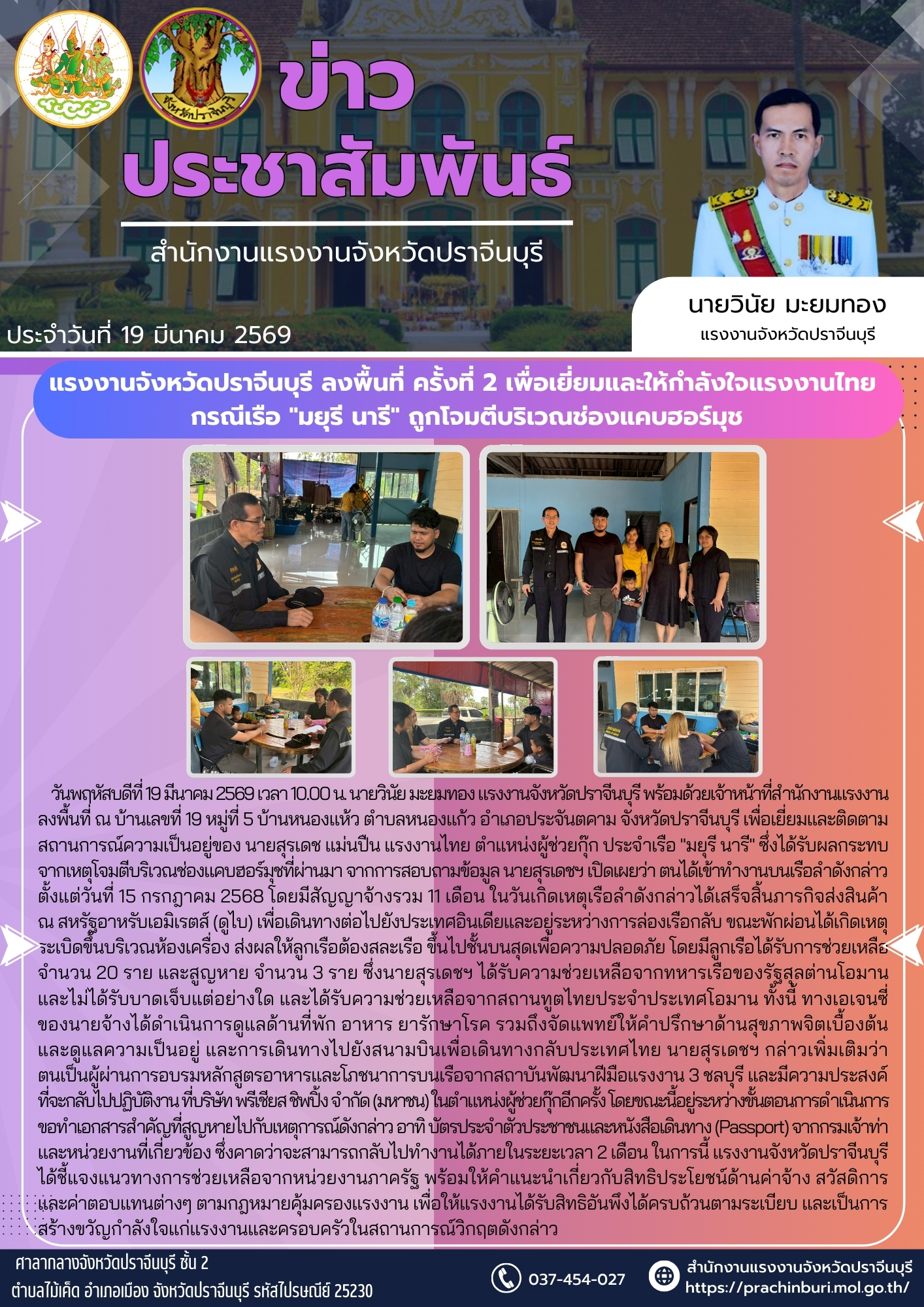 วันพฤหัสบดีที่ 19 มีนาคม 2569 เวลา 10.00 น. นายวินัย มะยมทอง แรงงานจังหวัดปราจีนบุรี พร้อมด้วยเจ้าหน้าที่สำนักงานแรงงาน ลงพื้นที่ ณ บ้านเลขที่ 19 หมู่ที่ 5 บ้านหนองแห้ว ตำบลหนองแก้ว อำเภอประจันตคาม จังหวัดปราจีนบุรี เพื่อเยี่ยมและติดตามสถานการณ์ความเป็นอยู่ของ นายสุรเดช แม่นปืน แรงงานไทย ตำแหน่งผู้ช่วยกุ๊ก ประจำเรือ “มยุรี นารี” ซึ่งได้รับผลกระทบจากเหตุโจมตีบริเวณช่องแคบฮอร์มุชที่ผ่านมา จากการสอบถามข้อมูล นายสุรเดชฯ เปิดเผยว่า ตนได้เข้าทำงานบนเรือลำดังกล่าว ตั้งแต่วันที่ 15 กรกฎาคม 2568 โดยมีสัญญาจ้างรวม 11 เดือน ในวันเกิดเหตุเรือลำดังกล่าวได้เสร็จสิ้นภารกิจส่งสินค้า ณ สหรัฐอาหรับเอมิเรตส์ (ดูไบ) เพื่อเดินทางต่อไปยังประเทศอินเดียและอยู่ระหว่างการล่องเรือกลับ ขณะพักผ่อนได้เกิดเหตุระเบิดขึ้นบริเวณห้องเครื่อง ส่งผลให้ลูกเรือต้องสละเรือ ขึ้นไปชั้นบนสุดเพื่อความปลอดภัย โดยมีลูกเรือได้รับการช่วยเหลือจำนวน 20 ราย และสูญหาย จำนวน 3 ราย ซึ่งนายสุรเดชฯ ได้รับความช่วยเหลือจากทหารเรือของรัฐสุลต่านโอมานและไม่ได้รับบาดเจ็บแต่อย่างใด และได้รับความช่วยเหลือจากสถานทูตไทยประจำประเทศโอมาน ทั้งนี้ ทางเอเจนซี่ของนายจ้างได้ดำเนินการดูแลด้านที่พัก อาหาร ยารักษาโรค รวมถึงจัดแพทย์ให้คำปรึกษาด้านสุขภาพจิตเบื้องต้น และดูแลความเป็นอยู่ และการเดินทางไปยังสนามบินเพื่อเดินทางกลับประเทศไทย นายสุรเดชฯ กล่าวเพิ่มเติมว่าตนเป็นผู้ผ่านการอบรมหลักสูตรอาหารและโภชนาการบนเรือจากสถาบันพัฒนาฝีมือแรงงาน 3 ชลบุรี และมีความประสงค์ที่จะกลับไปปฏิบัติงาน ที่บริษัท พรีเชียส ชิพปิ้ง จำกัด (มหาชน) ในตำแหน่งผู้ช่วยกุ๊กอีกครั้ง โดยขณะนี้อยู่ระหว่างขั้นตอนการดำเนินการขอทำเอกสารสำคัญที่สูญหายไปกับเหตุการณ์ดังกล่าว อาทิ บัตรประจำตัวประชาชนและหนังสือเดินทาง (Passport) จากกรมเจ้าท่าและหน่วยงานที่เกี่ยวข้อง ซึ่งคาดว่าจะสามารถกลับไปทำงานได้ภายในระยะเวลา 2 เดือน ในการนี้ แรงงานจังหวัดปราจีนบุรี ได้ชี้แจงแนวทางการช่วยเหลือจากหน่วยงานภาครัฐ พร้อมให้คำแนะนำเกี่ยวกับสิทธิประโยชน์ด้านค่าจ้าง สวัสดิการและค่าตอบแทนต่างๆ ตามกฎหมายคุ้มครองแรงงาน เพื่อให้แรงงานได้รับสิทธิอันพึงได้ครบถ้วนตามระเบียบ และเป็นการสร้างขวัญกำลังใจแก่แรงงานและครอบครัวในสถานการณ์วิกฤตดังกล่าว