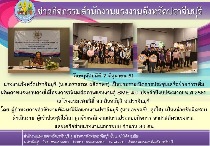 แรงงานจังหวัดปราจีนบุรี เปิดการประชุมเครือข่ายการเพิ่มผลิตภาพแรงงานภายใต้โครงการเพิ่มผลิตภาพแรงงานสู่ SME 4.0 ประจำปีงบประมาณ พ.ศ.2561