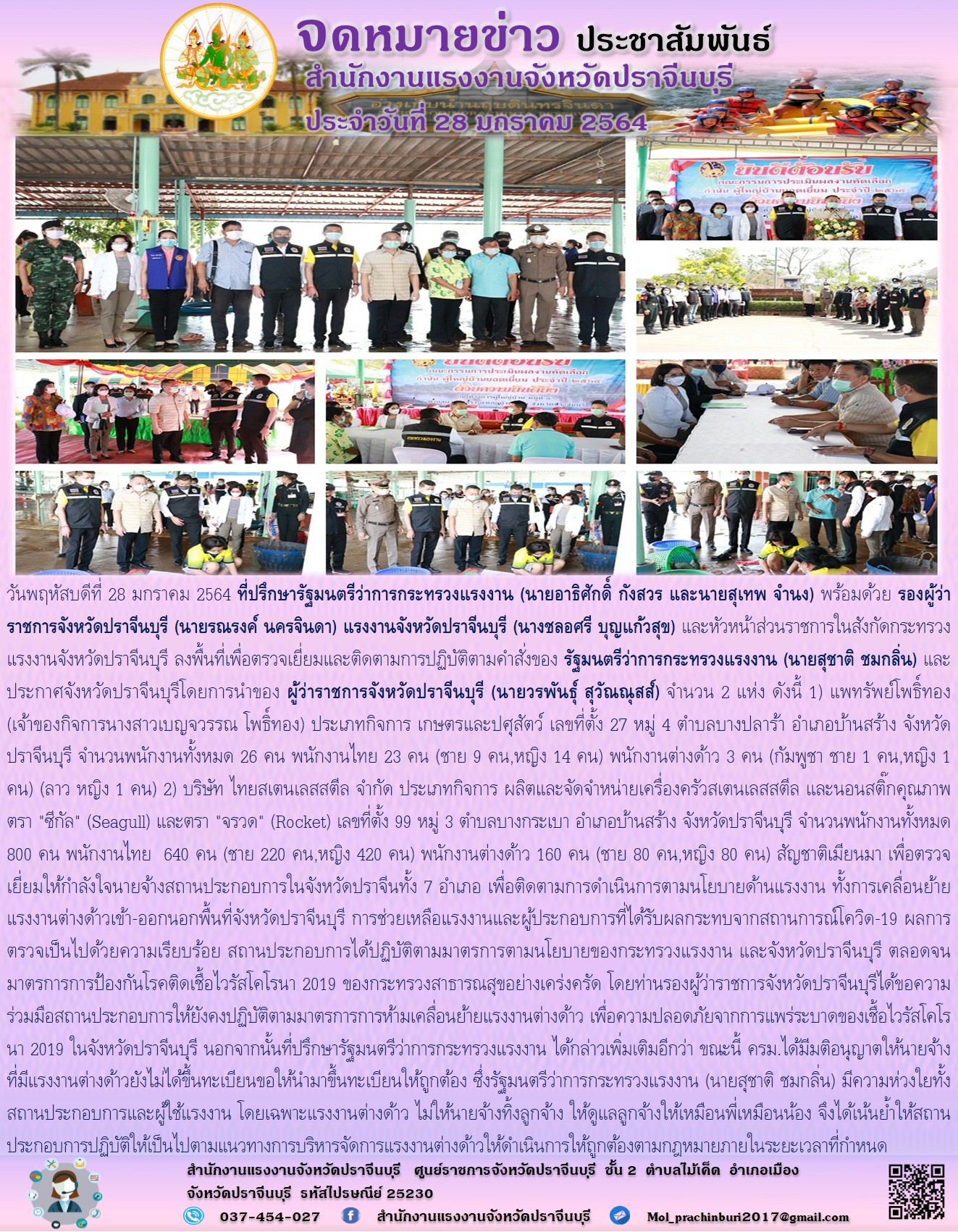 วันพฤหัสบดีที่ 28 มกราคม 2564 เวลา 09.00-12.00 รัฐมนตรีว่าการกระทรวงแรงงาน (นายสุชาติ ชมกลิ่น) มอบหมาย ที่ปรึกษารัฐมนตรีว่าการกระทรวงแรงงาน (นายอาธิศักดิ์ กังสวร และ นายสุเทพ จำนงค์) และ ผู้ว่าราชการจังหวัดปราจีนบุรี (นายวรพันธุ์ สุวัณณุสส์) มอบหมาย รองผู้ว่าราชการจังหวัดปราจีนบุรี (นายรณรงค์ นครจินดา) พร้อมหัวหน้าหน่วยงานสังกัดกระทรวงแรงงานจังหวัดปราจีนบุรี ประกอบด้วย นางชลอศรี บุญแก้วสุข แรงงานจังหวัดปราจีนบุรี นางสาวพรพิไล มะลอย ประกันสังคมจังหวัดปราจีนบุรี นายสิทธิชัย วารีชนานนท์ จัดหางานจังหวัดปราจีนบุรี นางสาววนิดา เงินรูปงาม ผู้อำนวยการสำนักงานพัฒนาฝีมือแรงงานปราจีนบุรี และนายวีระศักดิ์ หาญสมศรี ผู้แทนสวัสดิการและคุ้มครองแรงงานจังหวัดปราจีนบุรี พร้อมด้วยผกก.สภ.บ้านสร้าง (พ.ต.อ.มงคล โท้เป๋า),ผู้แทนนายอำเภอบ้านสร้าง ,และผู้แทน กอ.รมน. จังหวัดปราจีนบุรี ลงพื้นที่เพื่อตรวจเยี่ยม และติดตามการปฏิบัติตามคำสั่งของรัฐมนตรีว่าการกระทรวงแรงงาน และประกาศจังหวัดปราจีนบุรี จำนวน 2 แห่ง คือ