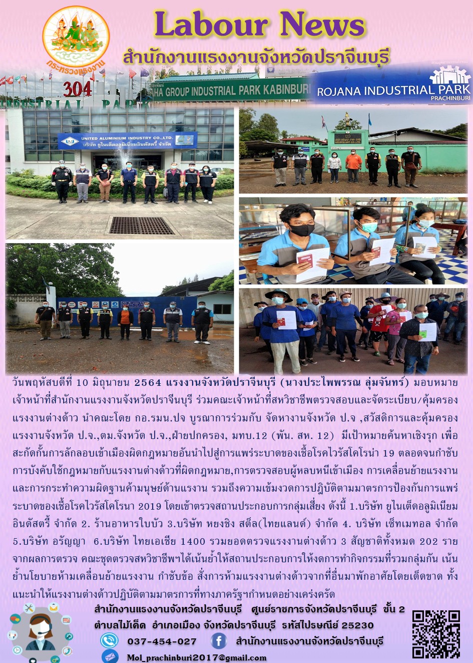 วันพฤหัสบดีที่ 10 มิถุนายน 2564 แรงงานจังหวัดปราจีนบุรี (นางประไพพรรณ ลุ่มจันทร์) มอบหมายเจ้าหน้าที่สำนักงานแรงงานจังหวัดปราจีนบุรี ร่วมคณะเจ้าหน้าที่สหวิชาชีพตรวจสอบและจัดระเบียบ/คุ้มครองแรงงานต่างด้าว นำคณะโดย กอ.รมน.ปจ บูรณาการร่วมกับ จัดหางานจังหวัด ป.จ ,สวัสดิการและคุ้มครองแรงงานจังหวัด ป.จ.,ตม.จังหวัด ป.จ.,ฝ่ายปกครอง, มทบ.12 (พัน. สห. 12) มีเป้าหมายค้นหาเชิงรุก เพื่อสะกัดกั้นการลักลอบเข้าเมืองผิดกฎหมายอันนำไปสู่การแพร่ระบาดของเชื้อโรคไวรัสโคโรน่า 19 ตลอดจนกำชับการบังคับใช้กฎหมายกับแรงงานต่างด้าวที่ผิดกฎหมาย,การตรวจสอบผู้หลบหนีเข้าเมือง การเคลื่อนย้ายแรงงานและการกระทำความผิดฐานค้ามนุษย์ด้านแรงาน รวมถึงความเข้มงวดการปฎิบัติตามมาตรการป้องกันการแพร่ระบาดของเชื้อโรคไวรัสโคโรนา 2019 โดยเข้าตรวจสถานประกอบการกลุ่มเสี่ยง มีผลการตรวจ ดังนี้