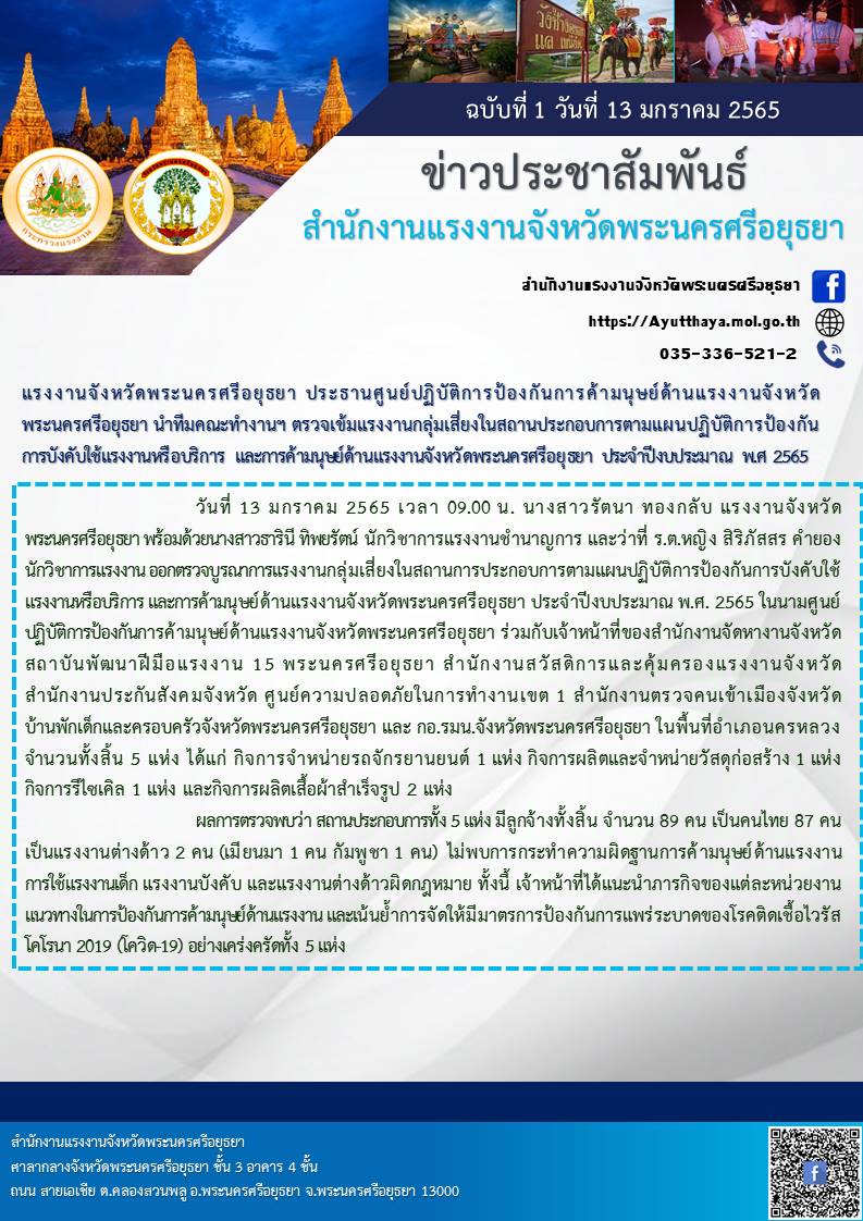 แรงงานจังหวัดพระนครศรีอยุธยา ประธานศูนย์ปฏิบัติการป้องกันการค้ามนุษย์ด้านแรงงานจังหวัดพระนครศรีอยุธยา นำทีมคณะทำงานฯ ตรวจเข้มแรงงานกลุ่มเสี่ยงในสถานประกอบการตามแผนปฏิบัติการป้องกันการบังคับใช้แรงงานหรือบริการ และการค้ามนุษย์ด้านแรงงานจังหวัดพระนครศรีอยุธยา ประจำปีงบประมาณ พ.ศ 2565