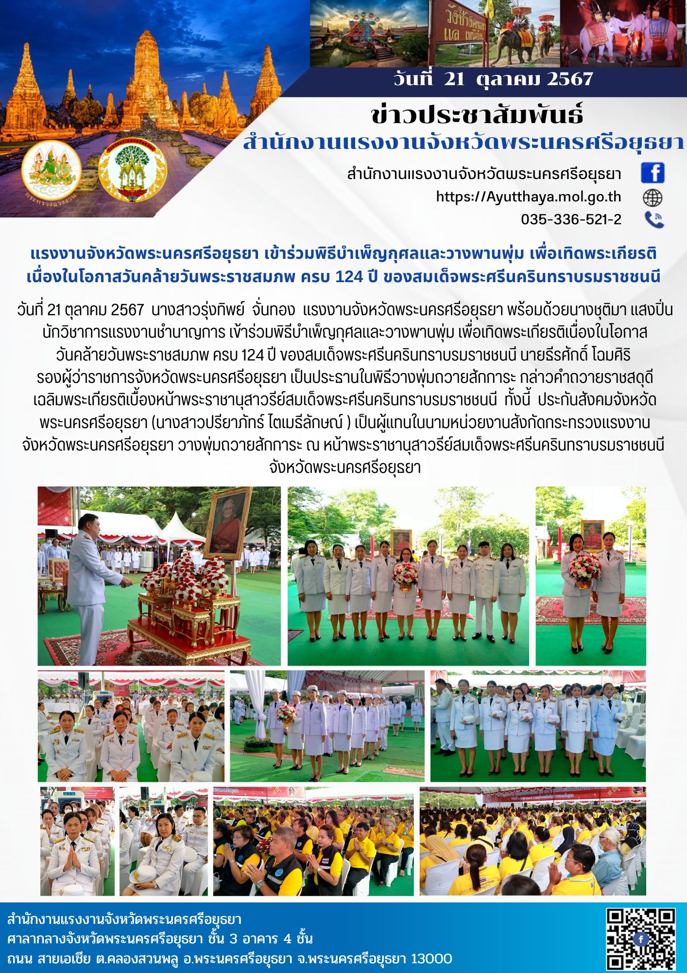 วันที่ 21 ตุลาคม 2567 นางสาวรุ่งทิพย์ จั่นทอง แรงงานจังหวัดพระนครศรีอยุธยา พร้อมด้วยนางชุติมา แสงปิ่น นักวิชาการแรงงานชำนาญการ เข้าร่วมพิธีบำเพ็ญกุศลและวางพานพุ่ม เพื่อเทิดพระเกียรติเนื่องในโอกาสวันคล้ายวันพระราชสมภพ ครบ 124 ปี ของสมเด็จพระศรีนครินทราบรมราชชนนี นายธีรศักดิ์ โฉมศิริ รองผู้ว่าราชการจังหวัดพระนครศรีอยุธยา เป็นประธานในพิธีวางพุ่มถวายสักการะ กล่าวคำถวายราชสดุดีเฉลิมพระเกียรติเบื้องหน้าพระราชานุสาวรีย์สมเด็จพระศรีนครินทราบรมราชชนนี ทั้งนี้ ประกันสังคมจังหวัดพระนครศรีอยุธยา (นางสาวปรียาภัทร์ ไตเมธีลักษณ์ ) เป็นผู้แทนในนามหน่วยงานสังกัดกระทรวงแรงงานจังหวัดพระนครศรีอยุธยา วางพุ่มถวายสักการะ ณ หน้าพระราชานุสาวรีย์สมเด็จพระศรีนครินทราบรมราชชนนี จังหวัดพระนครศรีอยุธยา