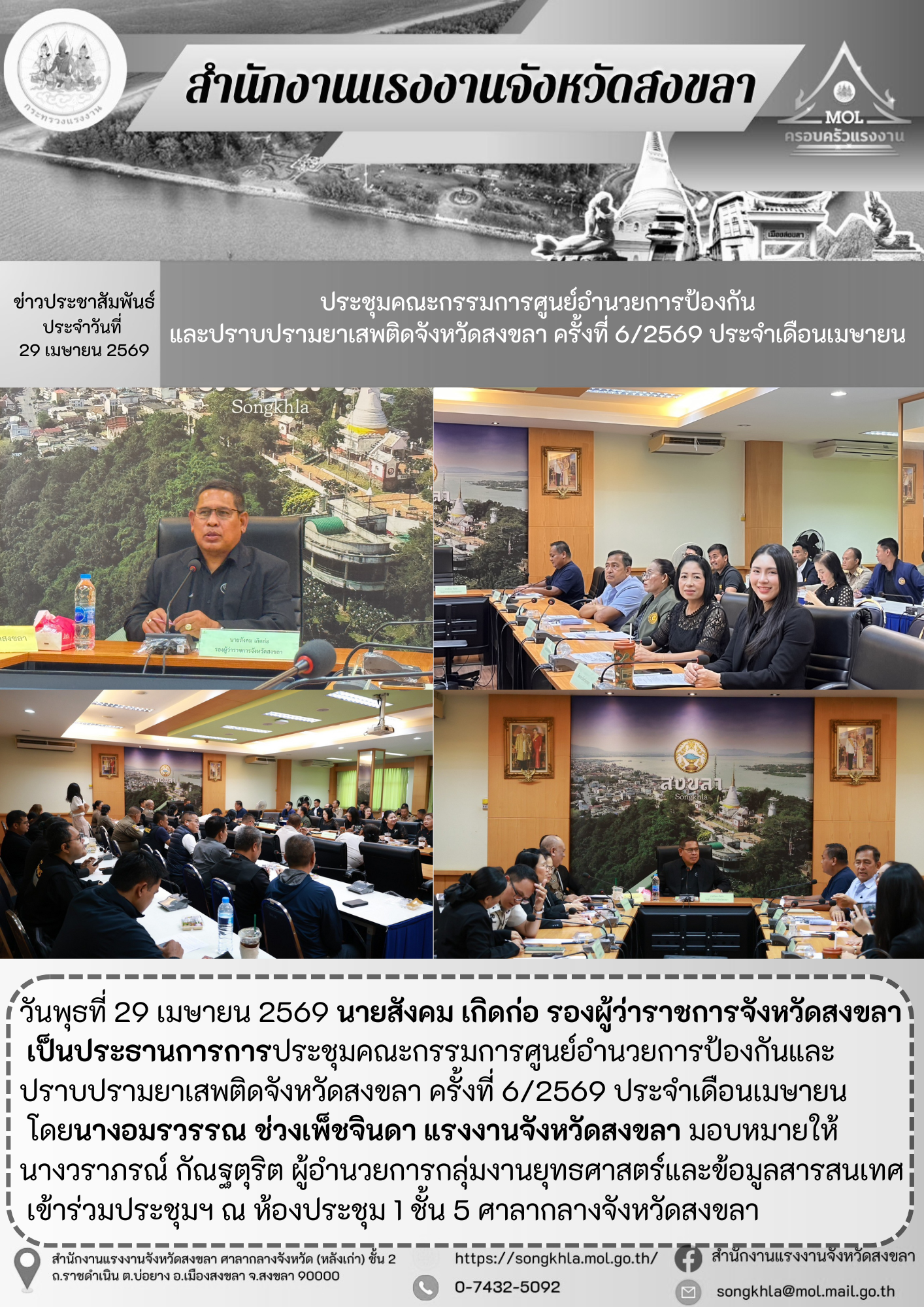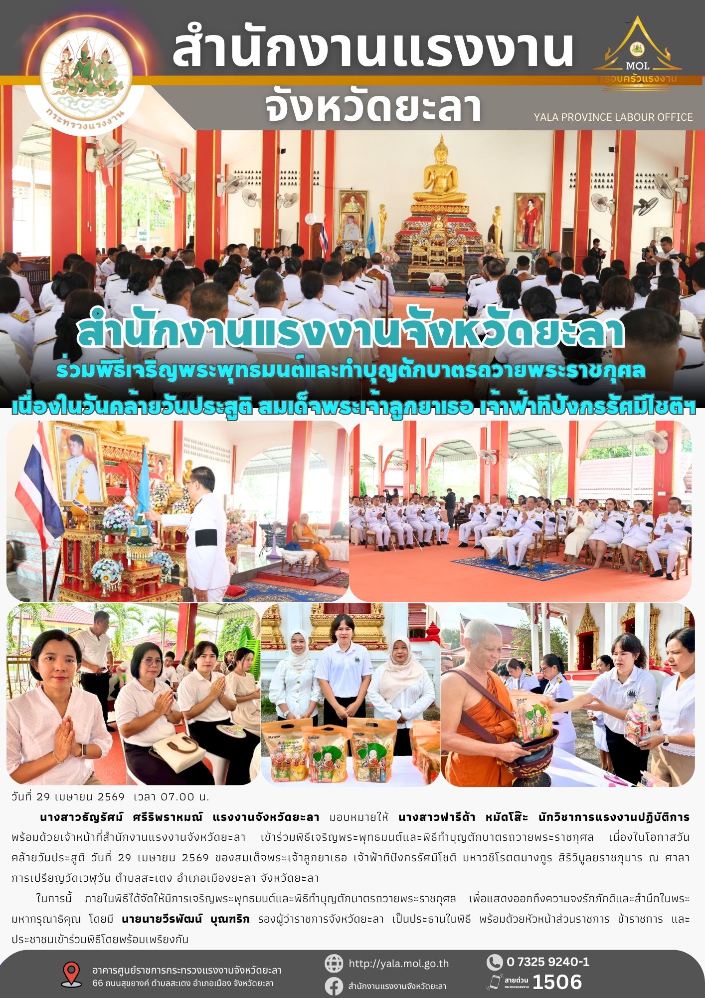 วันที่ 29 เมษายน 2569 เวลา 10.15 น. นางสาวรุ่งทิพย์ จั่นทอง แรงงานจังหวัดพระนครศรีอยุธยา เข้าร่วมพิธีเชิญเครื่องราชสักการะที่พระราชทานอุทิศถวายเป็นพุทธบูชา ณ เจดีย์สถานต่าง ๆ เนื่องในพระราชพิธีสงกรานต์ พุทธศักราช 2569 โดยมีนายชวนินทร์ วงศ์สถิตจิรกาล ผู้ว่าราชการจังหวัดพระนครศรีอยุธยา เป็นประธานในพิธีเปิดกรวยกระทงดอกไม้ ธูปเทียน แพ เบื้องหน้าพระบรมฉายาลักษณ์พระบาทสมเด็จพระเจ้าอยู่หัว เพื่อเป็นหลักให้พุทธศาสนิกชนได้ยึดถือศึกษาปฏิบัติตามโบราณราชประเพณีทุกประการ ณ วัดสุวรรณดาราราม จังหวัดพระนครศรีอยุธยา
