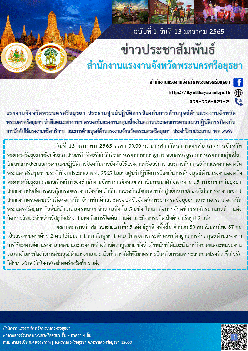 แรงงานจังหวัดพระนครศรีอยุธยา ประธานศูนย์ปฏิบัติการป้องกันการค้ามนุษย์ด้านแรงงานจังหวัดพระนครศรีอยุธยา นำทีมคณะทำงานฯ ตรวจเข้มแรงงานกลุ่มเสี่ยงในสถานประกอบการตามแผนปฏิบัติการป้องกันการบังคับใช้แรงงานหรือบริการ และการค้ามนุษย์ด้านแรงงานจังหวัดพระนครศรีอยุธยา
