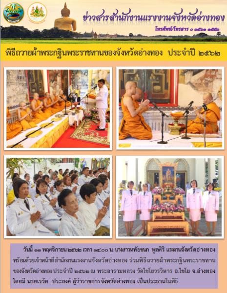 แรงงานจังหวัดพร้อมด้วยเจ้าหน้าที่ร่วมพิธีถวายผ้าพระกฐินพระราชทาน จ.อ่างทอง ปี 2562