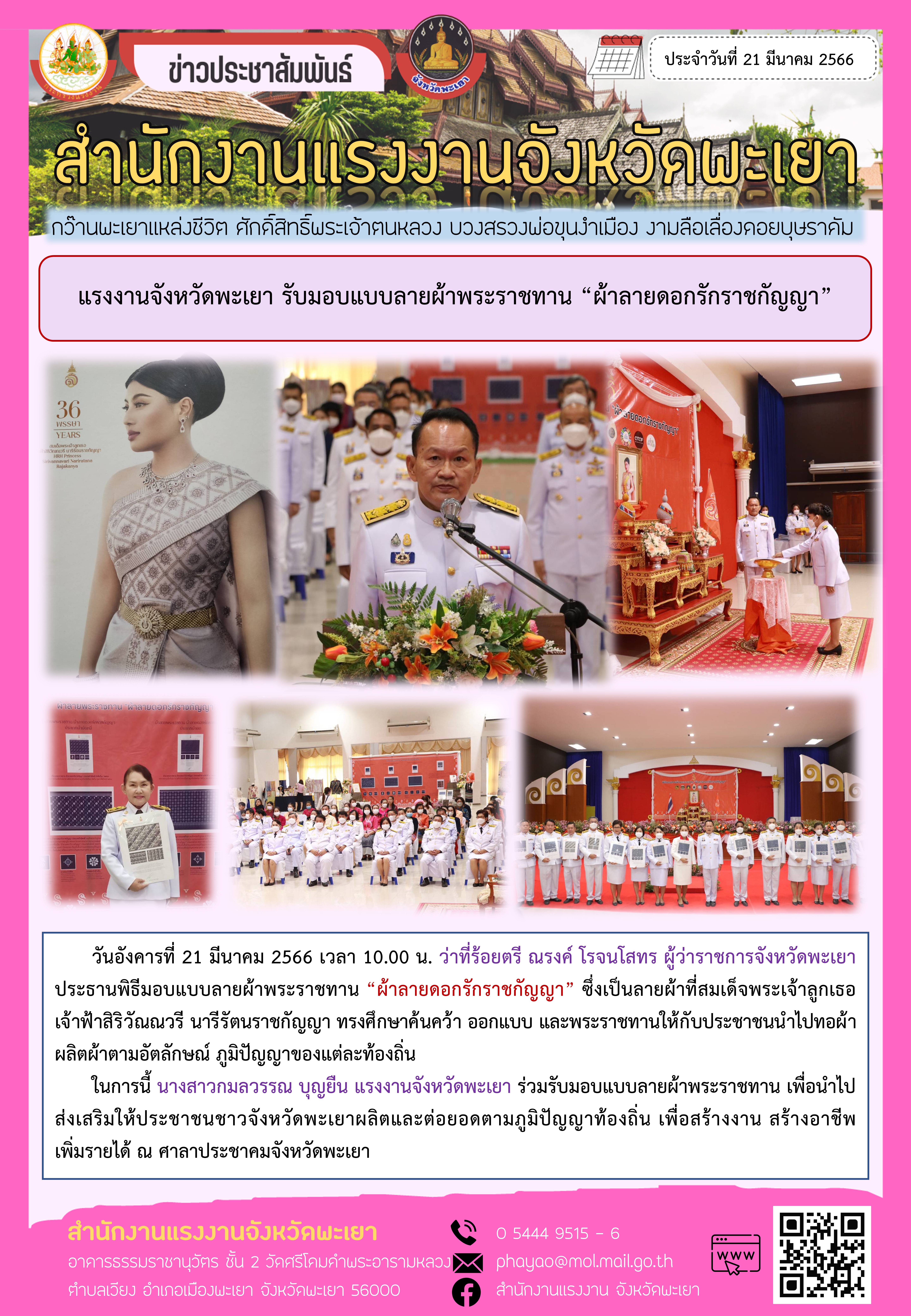 แรงงานจังหวัดพะเยา รับมอบแบบลายผ้าพระราชทาน “ผ้าลายดอกรักราชกัญญา”