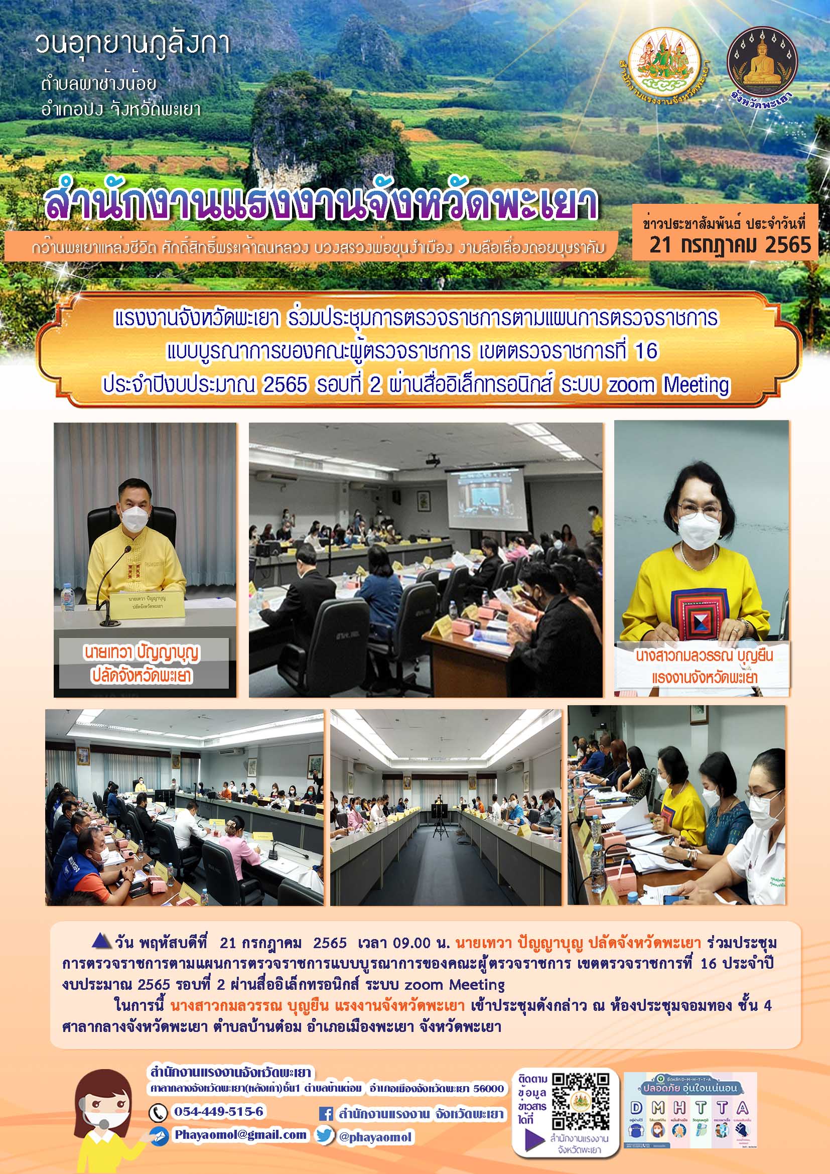 แรงงานจังหวัดพะเยา ร่วมประชุมการตรวจราชการตามแผนการตรวจราชการแบบบูรณาการของคณะผู้ตรวจราชการ เขตตรวจราชการที่ 16 ประจำปีงบประมาณ 2565 รอบที่ 2 ผ่านสื่ออิเล็กทรอนิกส์ ระบบ zoom Meeting วันพฤหัสบดีที่ 21 กรกฎาคม 2565 เวลา 09.00 น.นายเทวา ปัญญาบุญ ปลัดจังหวัดพะเยา ร่วมประชุมการตรวจราชการตามแผนการตรวจราชการแบบบูรณาการของคณะผู้ตรวจราชการ เขตตรวจราชการที่ 16 ประจำปีงบประมาณ 2565 รอบที่ 2 ผ่านสื่ออิเล็กทรอนิกส์ ระบบ zoom Meeting