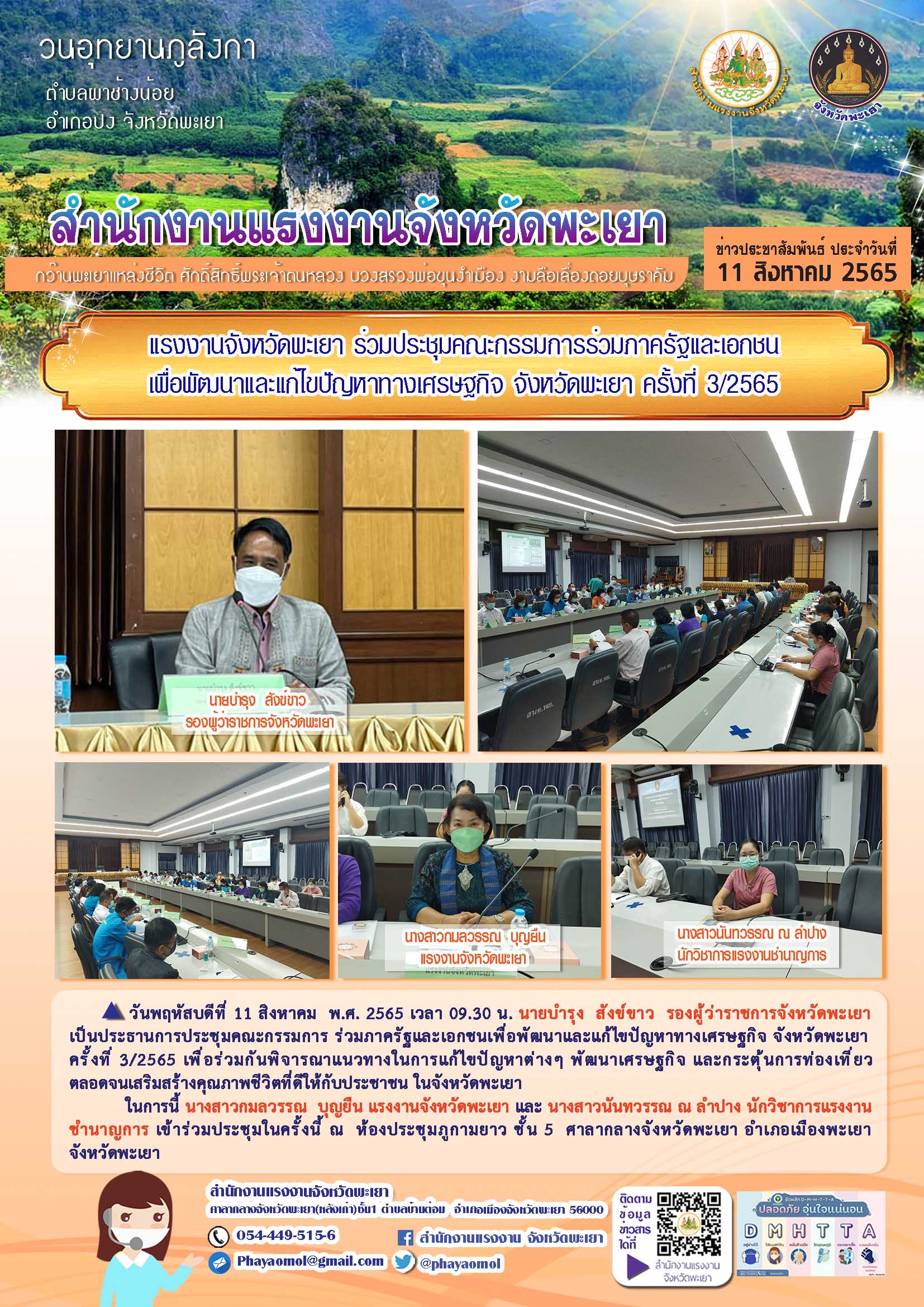 วันพฤหัสบดีที่ 11 สิงหาคม พ.ศ. 2565 เวลา 09.30 น. นายบำรุง สังข์ขาว รองผู้ว่าราชการจังหวัดพะเยา เป็นประธานการประชุมคณะกรรมการ ร่วมภาครัฐและเอกชนเพื่อพัฒนาและแก้ไขปัญหาทางเศรษฐกิจ จังหวัดพะเยา ครั้งที่ 3/2565 เพื่อร่วมกันพิจารณาแนวทางในการแก้ไขปัญหาต่างๆ พัฒนาเศรษฐกิจ และกระตุ้นการท่องเที่ยว ตลอดจนเสริมสร้างคุณภาพชีวิตที่ดีให้กับประชาชน ในจังหวัดพะเยา ในการนี้ นางสาวกมลวรรณ บุญยืน แรงงานจังหวัดพะเยา และ นางสาวนันทวรรณ ณ ลำปาง นักวิชาการแรงงานชำนาญการ เข้าร่วมประชุมในครั้งนี้ ณ ห้องประชุมภูกามยาว ชั้น 5 ศาลากลางจังหวัดพะเยา อำเภอเมืองพะเยา จังหวัดพะเยา