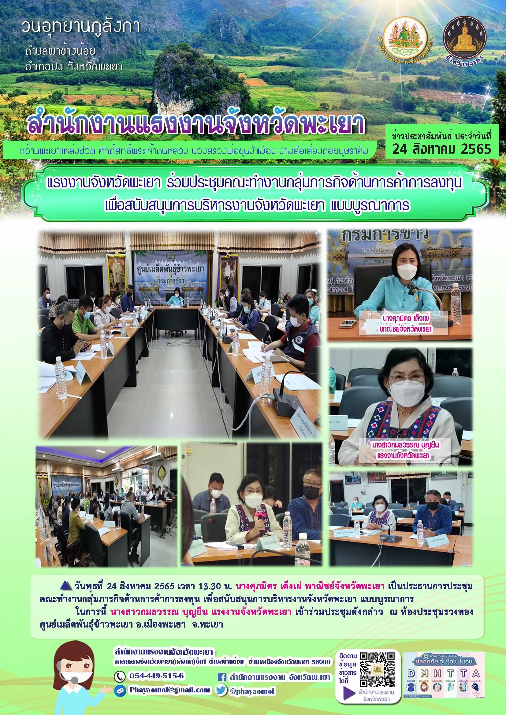 แรงงานจังหวัดพะเยา ร่วมประชุมคณะทำงานกลุ่มภารกิจด้านการค้าการลงทุน เพื่อสนับสนุนการบริหารงานจังหวัดพะเยา แบบบูรณาการ วันพุธที่ 24 สิงหาคม 2565 เวลา 13.30 น. นางศุภมิตร เต็งเผ่ พาณิชย์จังหวัดพะเยา เป็นประธานการประชุมคณะทำงานกลุ่มภารกิจด้านการค้าการลงทุน เพื่อสนับสนุนการบริหารงานจังหวัดพะเยา แบบบูรณาการ ในการนี้ นางสาวกมลวรรณ บุญยืน แรงงานจังหวัดพะเยา เข้าร่วมประชุมดังกล่าว ณ ห้องประชุมรวงทอง ศูนย์เมล็ดพันธุ์ข้าวพะเยา อ.เมืองพะเยา จ.พะเยา