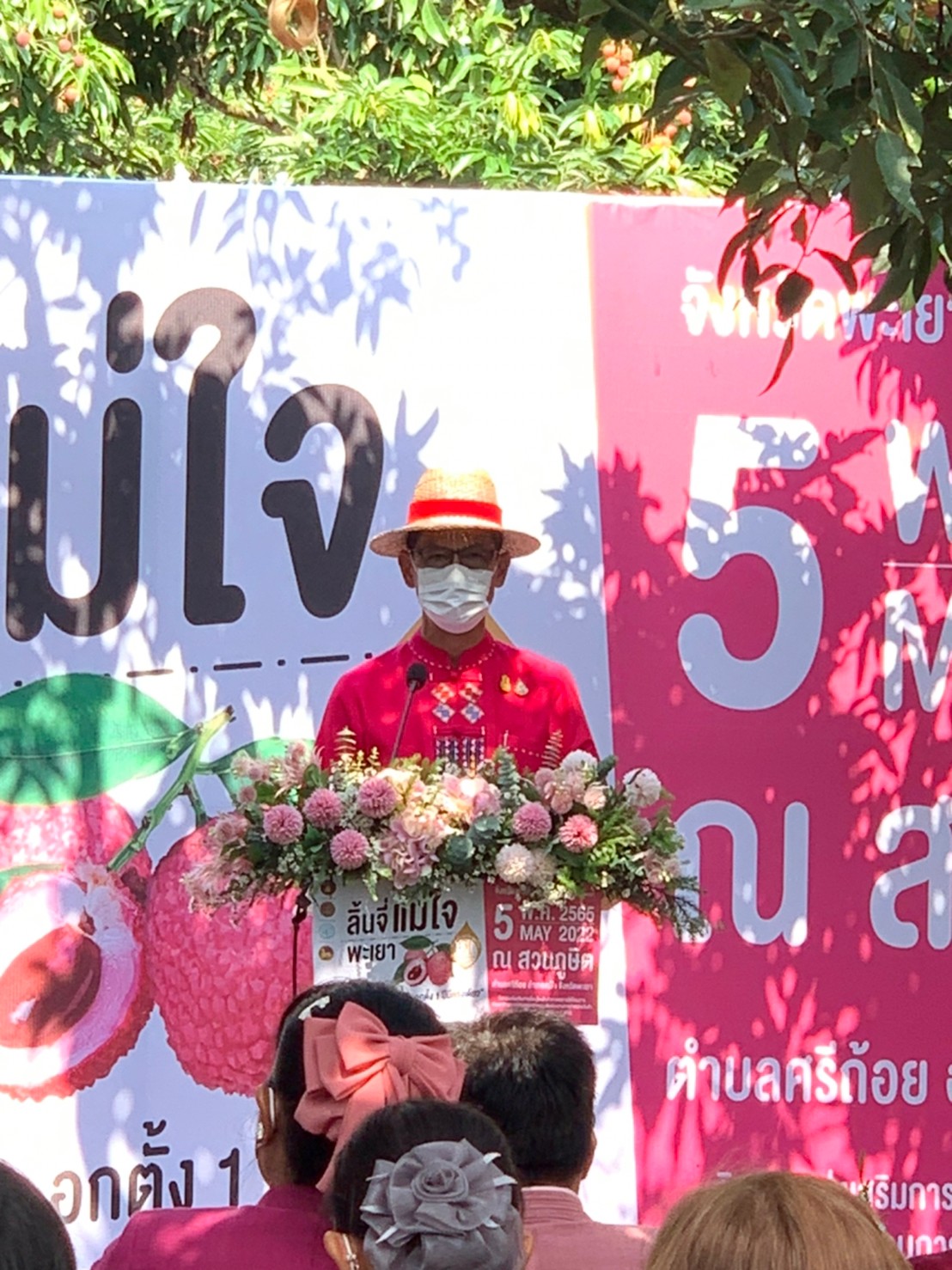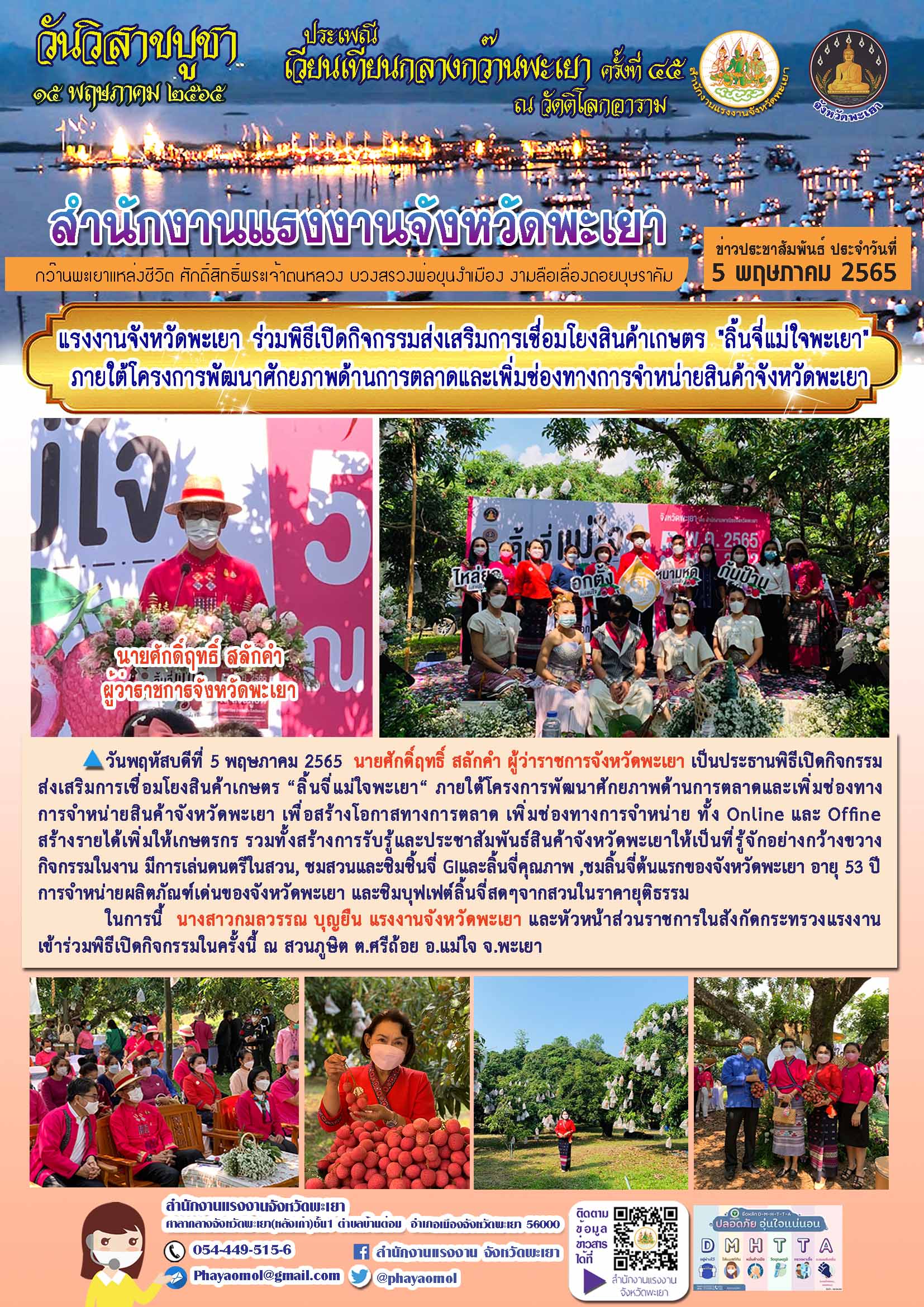 วันพฤหัสบดีที่ 5 พฤษภาคม 2565 นายศักดิ์ฤทธิ์ สลักคำ ผู้ว่าราชการจังหวัดพะเยา เป็นประธานพิธีเปิดกิจกรรมส่งเสริมการเชื่อมโยงสินค้าเกษตร “ ลิ้นจี่แม่ใจพะเยา “ ภายใต้โครงการพัฒนาศักยภาพด้านการตลาดและเพิ่มช่องทางการจำหน่ายสินค้าจังหวัดพะเยา เพื่อสร้างโอกาสทางการตลาด เพิ่มช่องทางการจำหน่าย ทั้ง Online และ Offine สร้างรายได้เพิ่มให้เกษตรกร รวมทั้งสร้างการรับรู้และประชาสัมพันธ์สินค้าจังหวัดพะเยาให้เป็นที่รู้จักอย่างกว้างขวาง กิจกรรมในงาน มีการเล่นดนตรีในสวน, ชมสวนและชิมชิ้นจี่ GIและลิ้นจี่คุณภาพ ,ชมลิ้นจี่ต้นแรกของจังหวัดพะเยา อายุ 53 ปี , การจำหน่ายผลิตภัณฑ์เด่นของจังหวัดพะเยา และชิมบุฟเฟต์ลิ้นจี่สดๆจากสวนในราคายุติธรรม ในการนี้ นางสาวกมลวรรณ บุญยืน แรงงานจังหวัดพะเยา และหัวหน้าส่วนราชการในสังกัดกระทรวงแรงงาน เข้าร่วมพิธีเปิดกิจกรรมในครั้งนี้ ณ สวนภูษิต ต.ศรีถ้อย อ.แม่ใจ จ.พะเยา