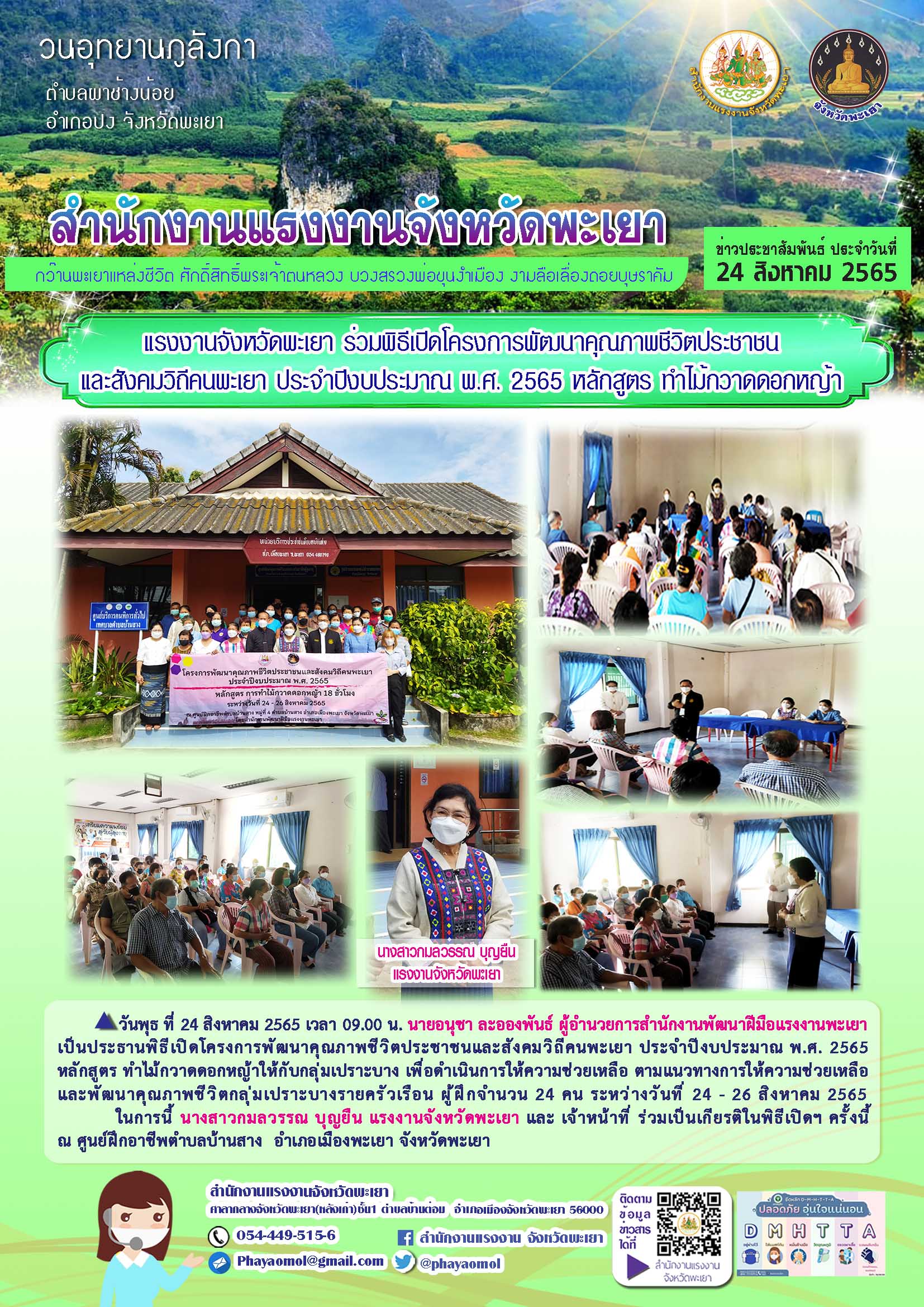 แรงงานจังหวัดพะเยา ร่วมพิธีเปิดโครงการพัฒนาคุณภาพชีวิตประชาชนและสังคมวิถีคนพะเยา ประจำปีงบประมาณ พ.ศ. 2565 หลักสูตร ทำไม้กวาดดอกหญ้า วันพุธ ที่ 24 สิงหาคม 2565 เวลา 09.00 น.