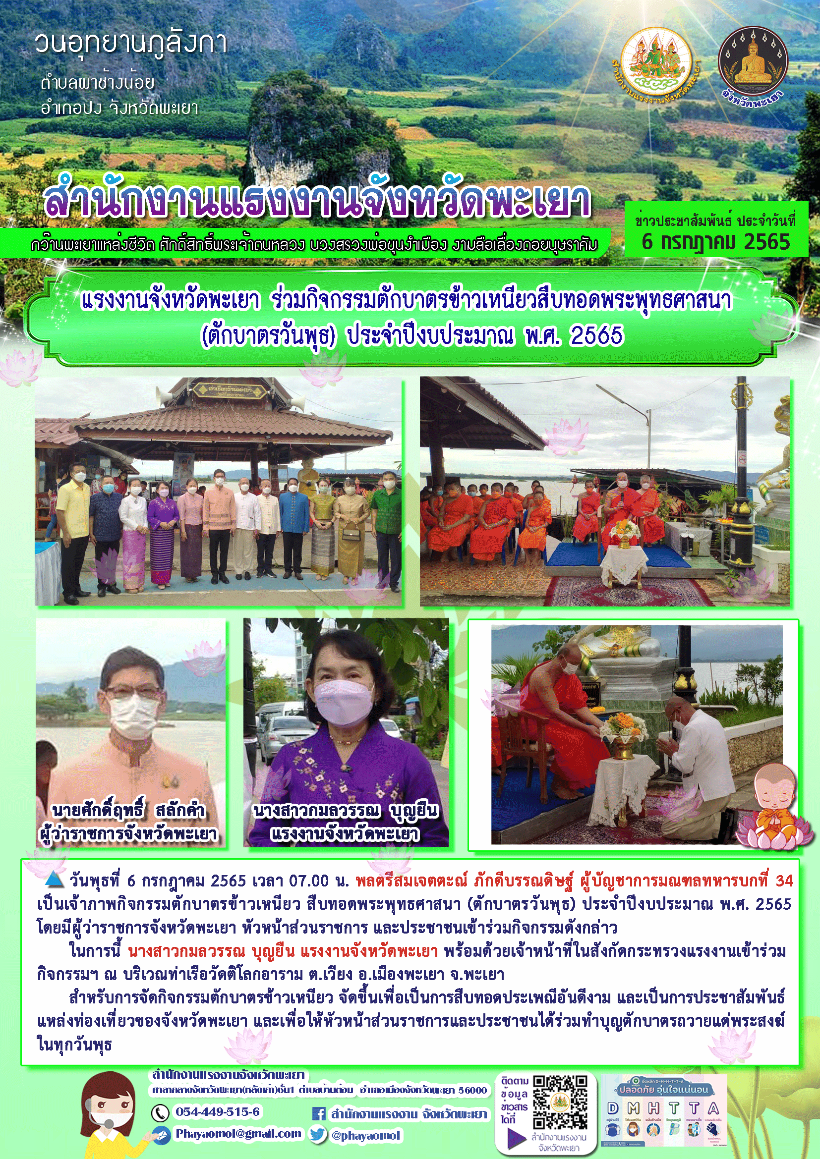 แรงงานจังหวัดพะเยา ร่วมกิจกรรมตักบาตรข้าวเหนียวสืบทอดพระพุทธศาสนา (ตักบาตรวันพุธ) ประจำปีงบประมาณ พ.ศ. 2565