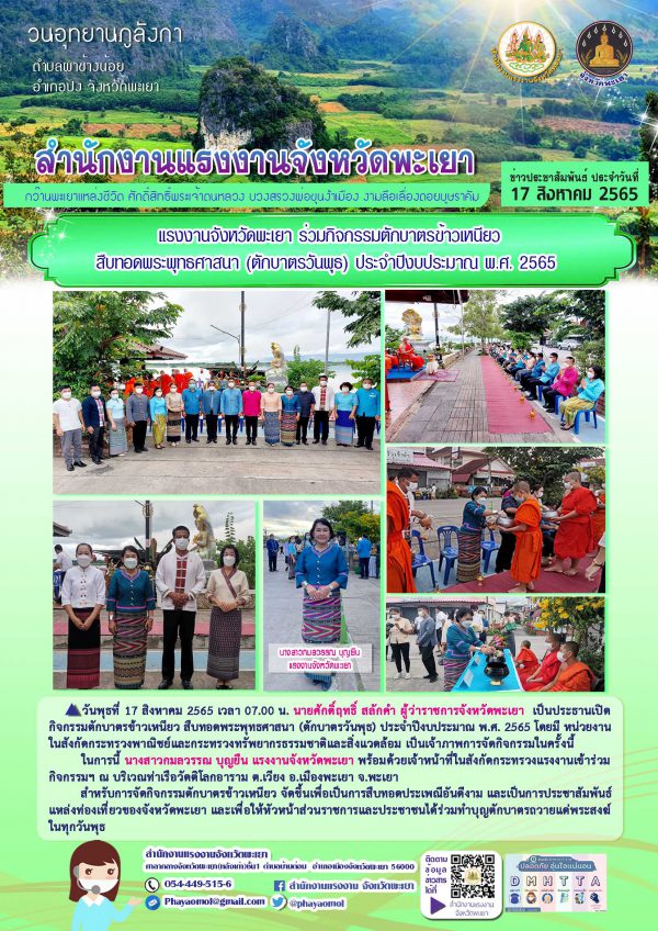 แรงงานจังหวัดพะเยา ร่วมกิจกรรมตักบาตรข้าวเหนียวสืบทอดพระพุทธศาสนา (ตักบาตรวันพุธ) ประจำปีงบประมาณ พ.ศ. 256 วันพุธที่ 17 สิงหาคม 2565 เวลา 07.00 น. นายศักดิ์ฤทธิ์ สลักคำ ผู้ว่าราชการจังหวัดพะเยา เป็นประธานเปิด กิจกรรมตักบาตรข้าวเหนียว สืบทอดพระพุทธศาสนา (ตักบาตรวันพุธ) ประจำปีงบประมาณ พ.ศ. 2565 โดยมี หน่วยงานในสังกัดกระทรวงพาณิชย์และกระทรวงทรัพยากรธรรมชาติและสิ่งแวดล้อม เป็นเจ้าภาพการจัดกิจกรรมในครั้งนี้ ในการนี้ นางสาวกมลวรรณ บุญยืน แรงงานจังหวัดพะเยา พร้อมด้วยเจ้าหน้าที่ในสังกัดกระทรวงแรงงานเข้าร่วมกิจกรรมฯ ณ บริเวณท่าเรือวัดติโลกอาราม ต.เวียง อ.เมืองพะเยา จ.พะเยา สำหรับการจัดกิจกรรมตักบาตรข้าวเหนียว จัดขึ้นเพื่อเป็นการสืบทอดประเพณีอันดีงาม และเป็นการประชาสัมพันธ์แหล่งท่องเที่ยวของจังหวัดพะเยา และเพื่อให้หัวหน้าส่วนราชการและประชาชนได้ร่วมทำบุญตักบาตรถวายแด่พระสงฆ์ในทุกวันพุธ