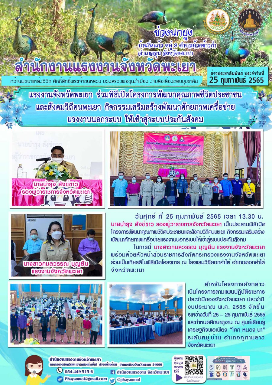 ในวันศุกร์ ที่ 25 กุมภาพันธ์ 2565 เวลา 13.30 น. นายบำรุง สังข์ขาว รองผู้ว่าราชการจังหวัดพะเยา เป็นประธานพิธีเปิด โครงการพัฒนาคุณภาพชีวิตประชาชนและสังคมวิถีคนพะเยา กิจกรรมเสริมสร้างพัฒนาศักยภาพเครื่อข่ายแรงงานนอกระบบให้เข้าสู่ระบบประกันสังคม ในการนี้ นางสาวกมลวรรณ บุญยืน แรงงานจังหวัดพะเยา พร้อมด้วยหัวหน้าส่วนราชการสังกัดกระทรวงแรงงานจังหวัดพะเยา ร่วมเป็นเกียรติในพิธีเปิดโครงการ ณ โรงแรมวีซีดอกคำใต้ อ.ดอกคำใต้ จ.พะเยา สำหรับโครงการดังกล่าวเป็นโครงการตามแผนปฏิบัติราชการประจำปีของจังหวัดพะเยา ประจำปีงบประมาณ พ.ศ. 2565 จัดขึ้นระหว่างวันที่ 25 – 26 กุมภาพันธ์ 2565 และกำหนดศึกษาดูงาน ณ ศูนย์เรียนรู้เศรษฐกิจพอเพียง “โคก หนอง นา” ระดับหมู่บ้าน อำเภอภูกามยาว จังหวัดพะเยา