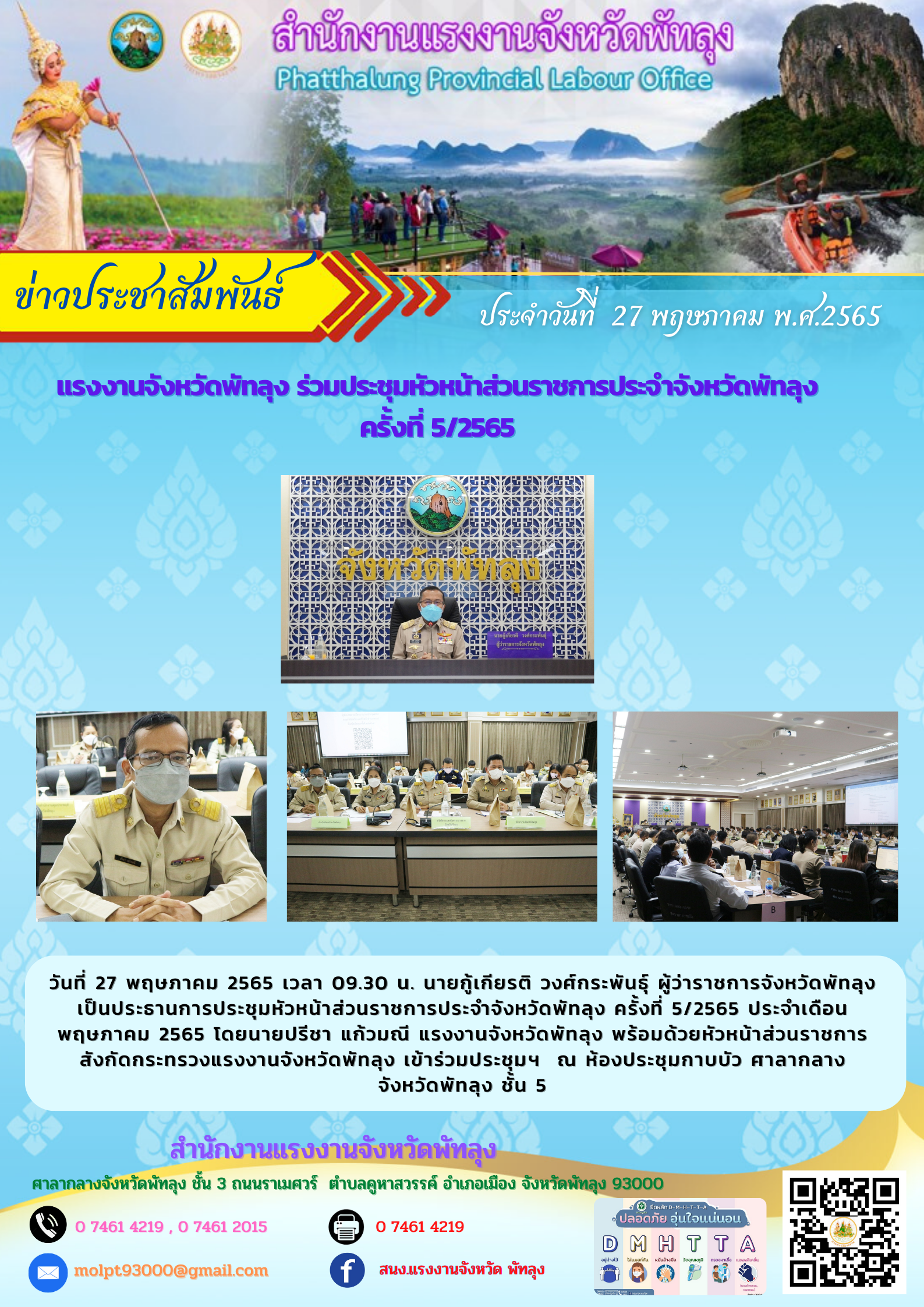 วันที่ 27 พฤษภาคม 2565 เวลา 09.30 น. นายกู้เกียรติ วงศ์กระพันธุ์ ผู้ว่าราชการจังหวัดพัทลุง เป็นประธานการประชุมหัวหน้าส่วนราชการประจำจังหวัดพัทลุง ครั้งที่ 5/2565 ประจำเดือนพฤษภาคม 2565 โดยนายปรีชา แก้วมณี แรงงานจังหวัดพัทลุง พร้อมด้วยหัวหน้าส่วนราชการสังกัดกระทรวงแรงงานจังหวัดพัทลุง เข้าร่วมประชุมฯ ณ ห้องประชุมกาบบัว ศาลากลางจังหวัดพัทลุง ชั้น 5