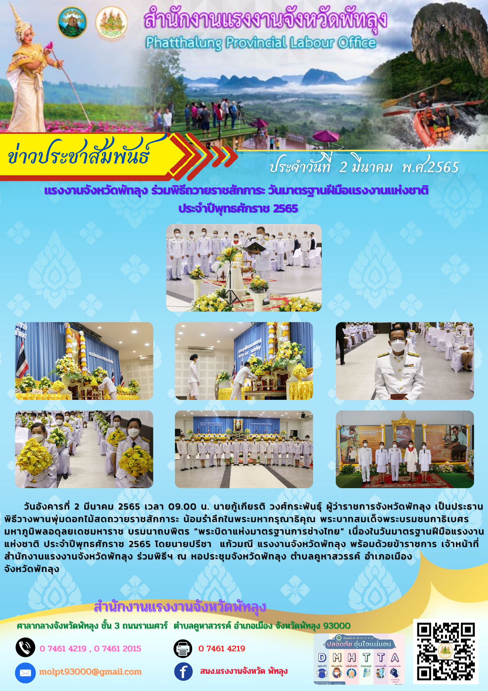 วันอังคารที่ 2 มีนาคม 2565 เวลา 09.00 น. นายกู้เกียรติ วงศ์กระพันธุ์ ผู้ว่าราชการจังหวัดพัทลุง เป็นประธานพิธีวางพานพุ่มดอกไม้สดถวายราชสักการะ น้อมรำลึกในพระมหากรุณาธิคุณ พระบาทสมเด็จพระบรมชนกาธิเบศร มหาภูมิพลอดุลยเดชมหาราช บรมนาถบพิตร “พระบิดาแห่งมาตรฐานการช่างไทย” เนื่องในวันมาตรฐานฝีมือแรงงานแห่งชาติ ประจำปีพุทธศักราช 2565 โดยนายปรีชา แก้วมณี แรงงานจังหวัดพัทลุง พร้อมด้วยข้าราชการ เจ้าหน้าที่สำนักงานแรงงานจังหวัดพัทลุงร่วมพิธีฯ ณ หอประชุมจังหวัดพัทลุง ตำบลคูหาสวรรค์ อำเภอเมือง จังหวัดพัทลุง