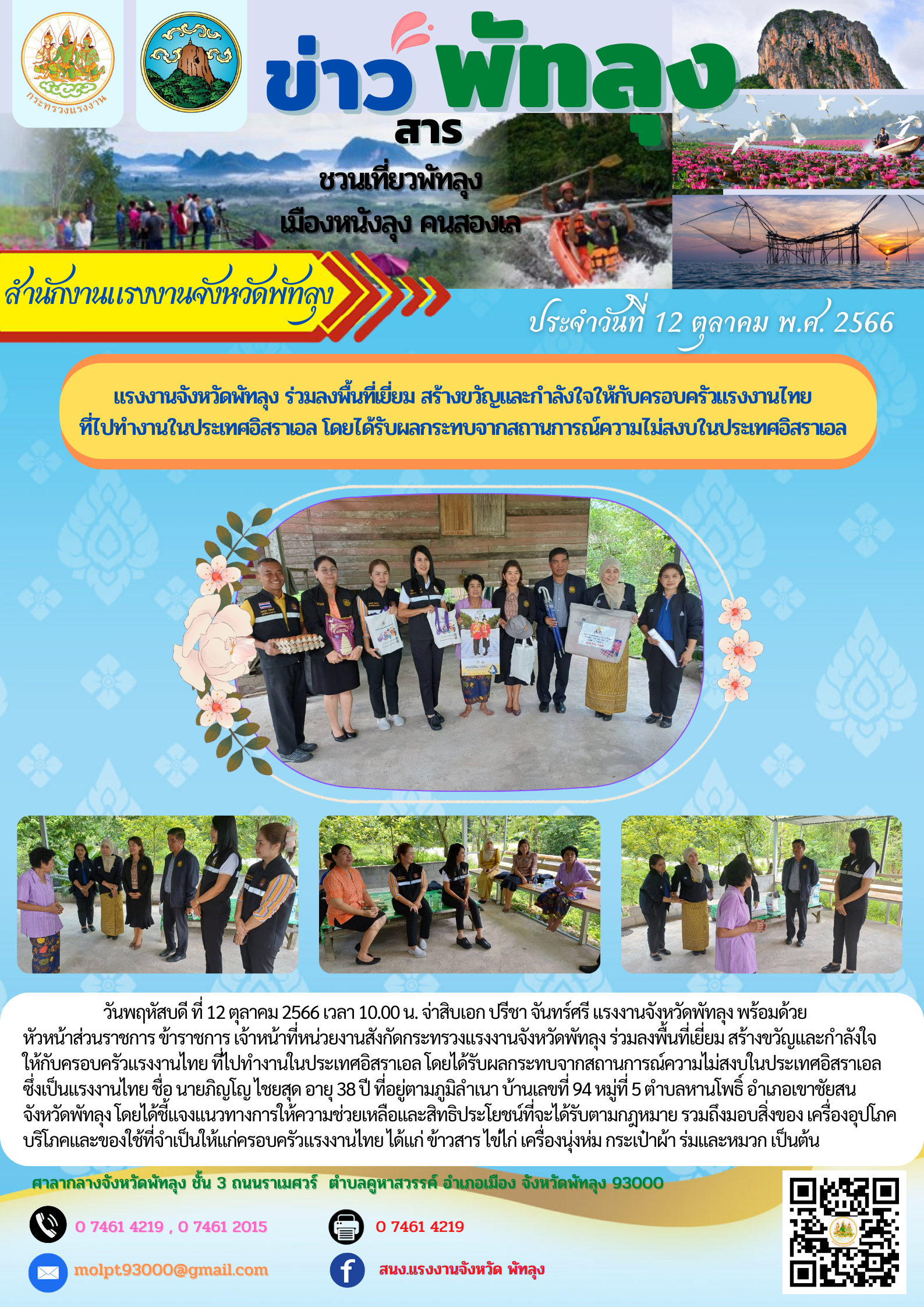 วันพฤหัสบดี ที่ 12 ตุลาคม 2566 เวลา 10.00 น. จ่าสิบเอก ปรีชา จันทร์ศรี แรงงานจังหวัดพัทลุง พร้อมด้วย หัวหน้าส่วนราชการ ข้าราชการ เจ้าหน้าที่หน่วยงานสังกัดกระทรวงแรงงานจังหวัดพัทลุง ร่วมลงพื้นที่เยี่ยม สร้างขวัญและกำลังใจ ให้กับครอบครัวแรงงานไทย ที่ไปทำงานในประเทศอิสราเอล โดยได้รับผลกระทบจากสถานการณ์ความไม่สงบในประเทศอิสราเอล ซึ่งเป็นแรงงานไทย ชื่อ นายภิญโญ ไชยสุด อายุ 38 ปี ที่อยู่ตามภูมิลำเนา บ้านเลขที่ 94 หมู่ที่ 5 ตำบลหานโพธิ์ อำเภอเขาชัยสน จังหวัดพัทลุง โดยได้ชี้แจงแนวทางการให้ความช่วยเหลือและสิทธิประโยชน์ที่จะได้รับตามกฎหมาย รวมถึงมอบสิ่งของ เครื่องอุปโภคบริโภคและของใช้ที่จำเป็นให้แก่ครอบครัวแรงงานไทย ได้แก่ ข้าวสาร ไข่ไก่ เครื่องนุ่งห่ม กระเป๋าผ้า ร่มและหมวก เป็นต้น