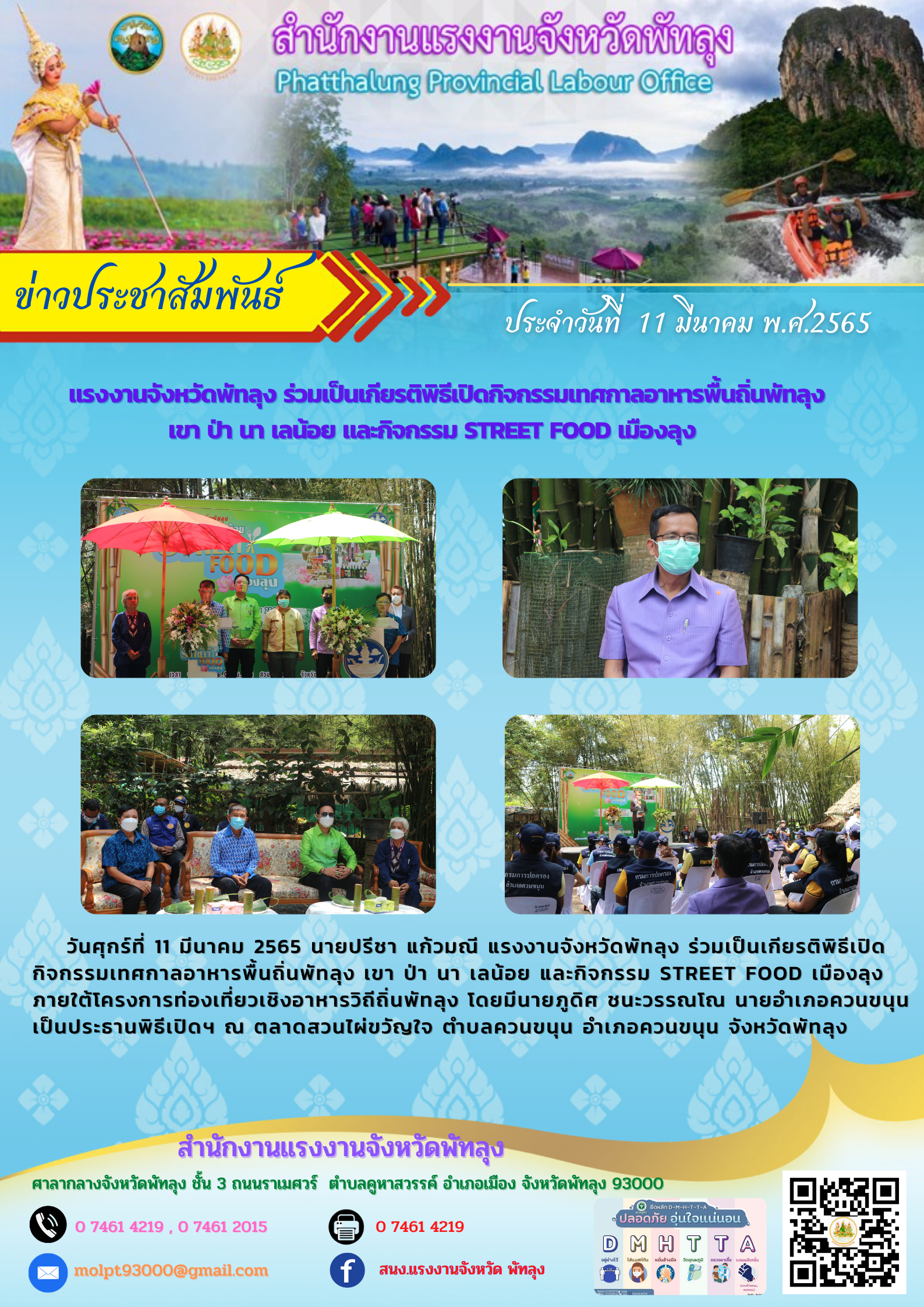 วันศุกร์ที่ 11 มีนาคม 2565 นายปรีชา แก้วมณี แรงงานจังหวัดพัทลุง ร่วมเป็นเกียรติพิธีเปิดกิจกรรมเทศกาลอาหารพื้นถิ่นพัทลุง เขา ป่า นา เลน้อย และกิจกรรม Street Food เมืองลุง ภายใต้โครงการท่องเที่ยวเชิงอาหารวิถีถิ่นพัทลุง โดยมีนายภูดิศ ชนะวรรณโณ นายอำเภอควนขนุน เป็นประธานพิธีเปิดฯ ณ ตลาดสวนไผ่ขวัญใจ ตำบลควนขนุน อำเภอควนขนุน จังหวัดพัทลุง