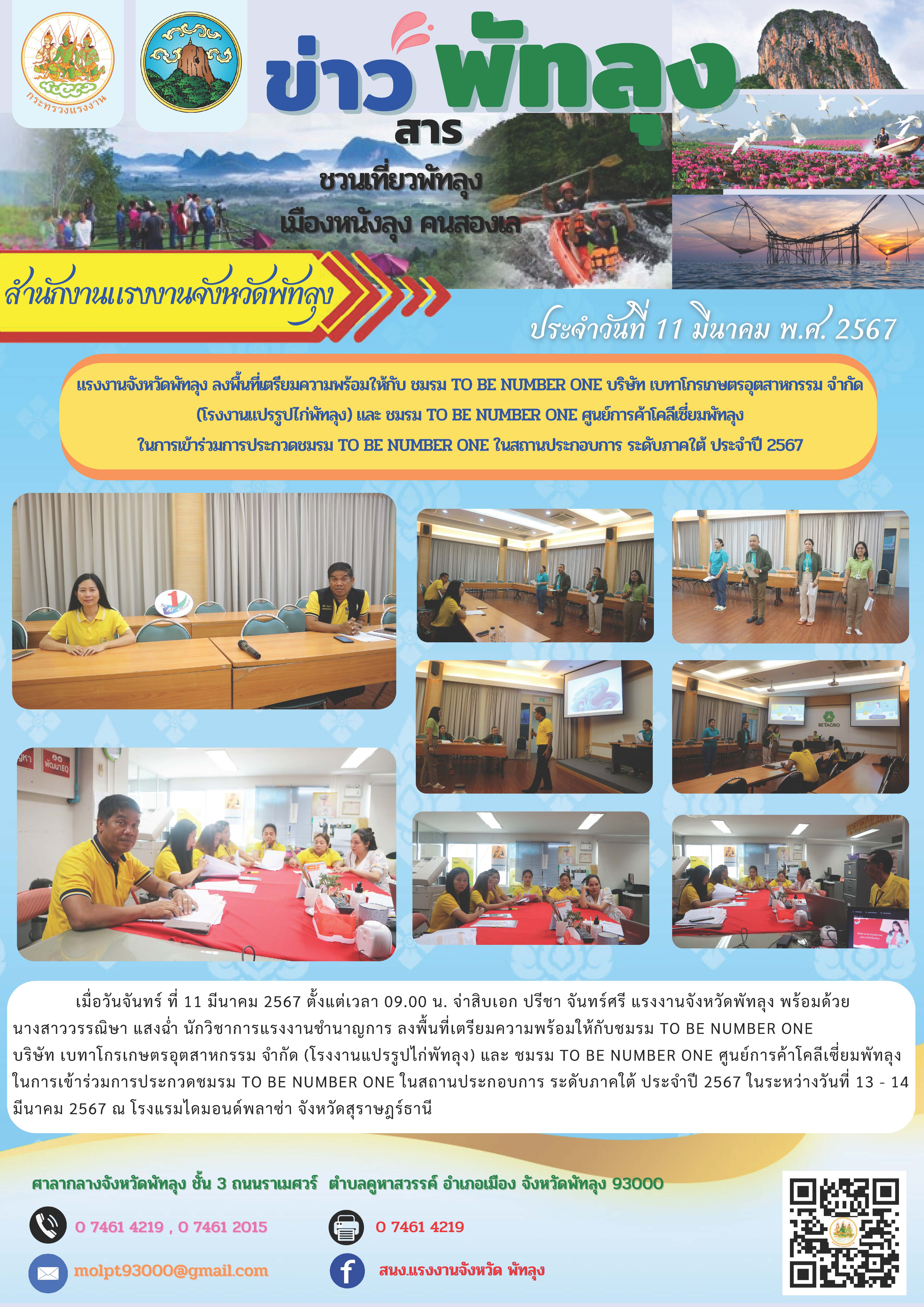 เมื่อวันจันทร์ ที่ 11 มีนาคม 2567 ตั้งแต่เวลา 09.00 น. จ่าสิบเอก ปรีชา จันทร์ศรี แรงงานจังหวัดพัทลุง พร้อมด้วย นางสาววรรณิษา แสงฉ่ำ นักวิชาการแรงงานชำนาญการ ลงพื้นที่เตรียมความพร้อมให้กับชมรม TO BE NUMBER ONE บริษัท เบทาโกรเกษตรอุตสาหกรรม จำกัด (โรงงานแปรรูปไก่พัทลุง) และ ชมรม TO BE NUMBER ONE ศูนย์การค้าโคลีเซี่ยมพัทลุง ในการเข้าร่วมการประกวดชมรม TO BE NUMBER ONE ในสถานประกอบการ ระดับภาคใต้ ประจำปี 2567 ในระหว่างวันที่ 13 – 14 มีนาคม 2567 ณ โรงแรมไดมอนด์พลาซ่า จังหวัดสุราษฎร์ธานี