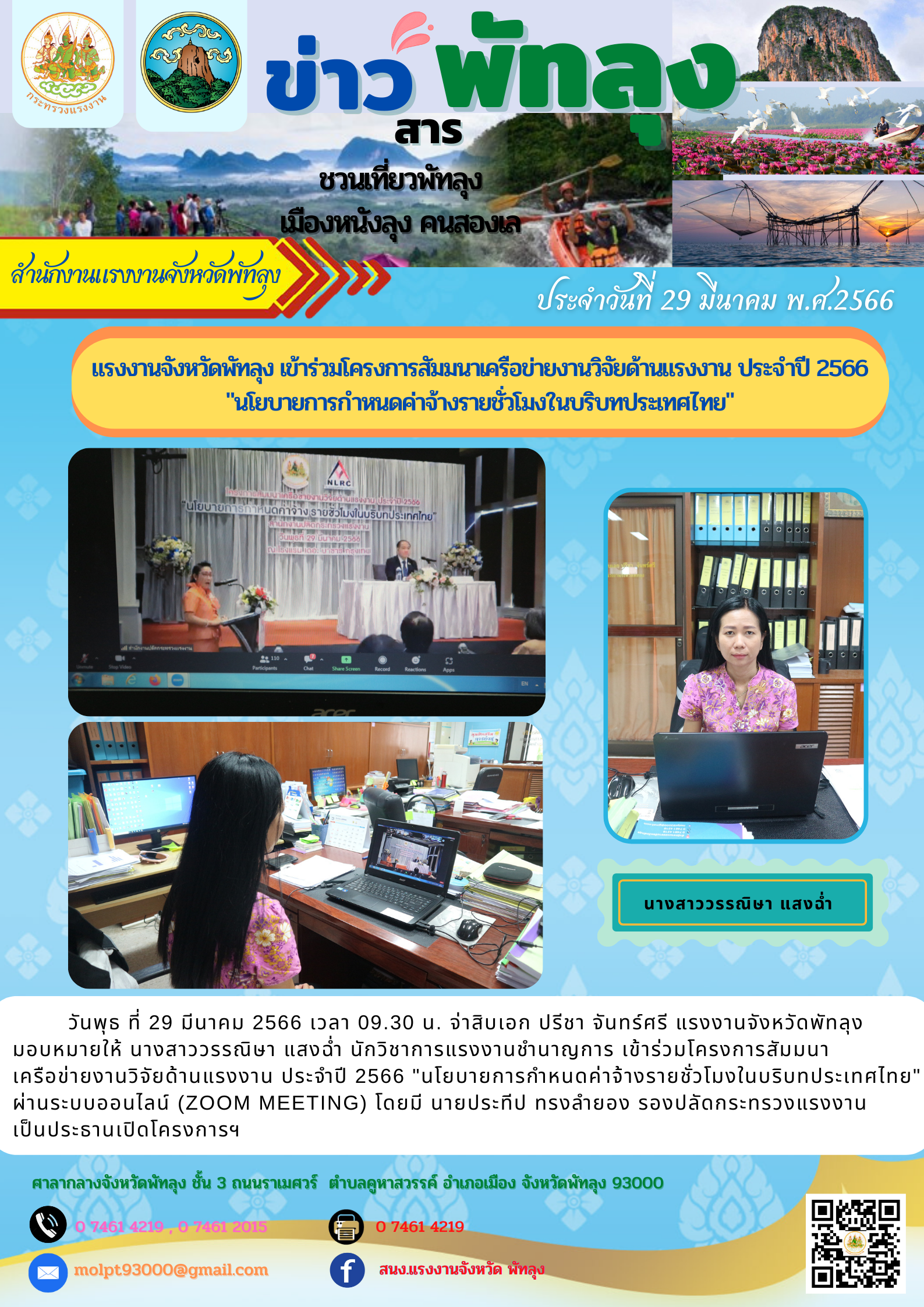 วันพุธ ที่ 29 มีนาคม 2566 เวลา 09.30 น. จ่าสิบเอก ปรีชา จันทร์ศรี แรงงานจังหวัดพัทลุง มอบหมายให้ นางสาววรรณิษา แสงฉ่ำ นักวิชาการแรงงานชำนาญการ เข้าร่วมโครงการสัมมนา เครือข่ายงานวิจัยด้านแรงงาน ประจำปี 2566 “นโยบายการกำหนดค่าจ้างรายชั่วโมงในบริบทประเทศไทย” ผ่านระบบออนไลน์ (zoom meeting) โดยมี นายประทีป ทรงลำยอง รองปลัดกระทรวงแรงงาน เป็นประธานเปิดโครงการฯ