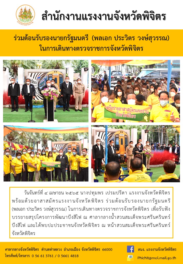แรงงานจังหวัดพิจิตร พร้อมด้วยอาสาสมัครแรงงาน ร่วมต้อนรับรองนายกรัฐมนตรี (พลเอก ประวิตร วงษ์สุวรรณ) ในการเดินทางมาตรวจราชการจังหวัดพิจิตร