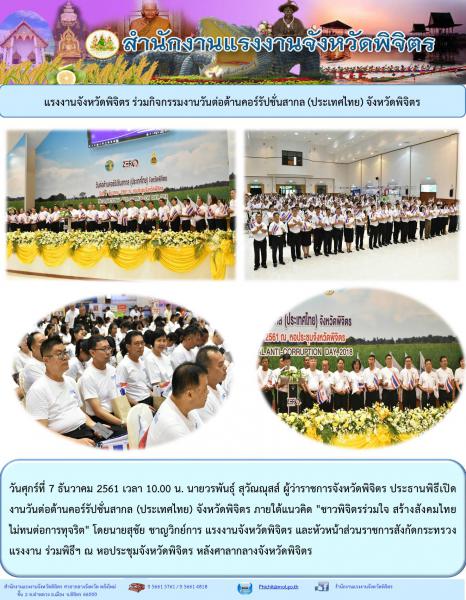 วันศุกร์ที่ 7 ธันวาคม 2561 เวลา 10.00 น. นายวรพันธุ์ สุวัณณุสส์ ผู้ว่าราชการจังหวัดพิจิตร ประธานพิธีเปิดงานวันต่อต้านคอร์รัปชั่นสากล (ประเทศไทย) จังหวัดพิจิตร ภายใต้แนวคิด "ชาวพิจิตรร่วมใจ สร้างสังคมไทย ไม่ทนต่อการทุจริต" โดยนายสุชัย ชาญวิกย์การ แรงงานจังหวัดพิจิตร และหัวหน้าส่วนราชการสังกัดกระทรวงแรงงาน ร่วมพิธีฯ ณ หอประชุมจังหวัดพิจิตร หลังศาลากลางจังหวัดพิจิตร