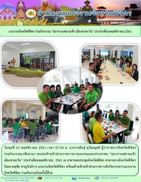 วันพุธที่ 21 พฤศจิกายน 2561 เวลา 07.30 น. นายวรพันธุ์ สุวัณณุสส์ ผู้ว่าราชการจังหวัดพิจิตร ร่วมกิจกรรมเวทีเสวนา พบปะหัวหน้าส่วนราชการภาคเอกชนและประชาชน "สภากาแฟยามเช้าเมืองชาละวัน" ประจำเดือนพฤศจิกายน 2561 ณ อาคารหอประชุมจังหวัดพิจิตร ศาลากลางจังหวัดพิจิตร โดยนายสุชัย ชาญวิกย์การ แรงงานจังหวัดพิจิตร พร้อมด้วยหัวหน้าส่วนราชการสังกัดกระทรวงแรงงานจังหวัดพิจิตร ร่วมกิจกรรมในครั้งนี้ด้วย