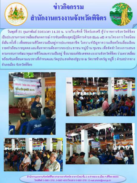 วันพุธที่ 21 กุมภาพันธ์ 2561เวลา 14.30 น. นายวีระศักดิ์ วิจิตร์แสงศรี ผู้ว่าราชการจังหวัดพิจิตร เป็นประธานการตรวจเยี่ยมสังเกตการณ์ การขับเคลื่อนชุดปฏิบัติการตำบล (Kick off) ตามโครงการไทยนิยม ยั่งยืน ครั้งที่ 1 เพื่อสอบถามชีวิตความเป็นอยู่/การประกอบอาชีพ วิเคราะห์ปัญหาความเดือดร้อนเยี่ยมเยียนรายครัวเรือน/รายบุคคล และค้นหาความต้องการของประชาชน/หมู่บ้าน/ชุมชน เพื่อจัดทำโครงการเสนอ ตามกรอบการพัฒนาคุณภาพชีวิตและความเป็นอยู่ ซึ่งนายมนต์ชัย เดชพล แรงงานจังหวัดพิจิตร ร่วมตรวจเยี่ยมพร้อมขับเคลื่อนตามแนวทางที่กำหนดและวัตถุประสงค์ของรัฐบาล ณ วัดราชช้างขวัญ หมู่ที่ 1 ตำบลปากทาง อำเภอเมือง จังหวัดพิจิตร