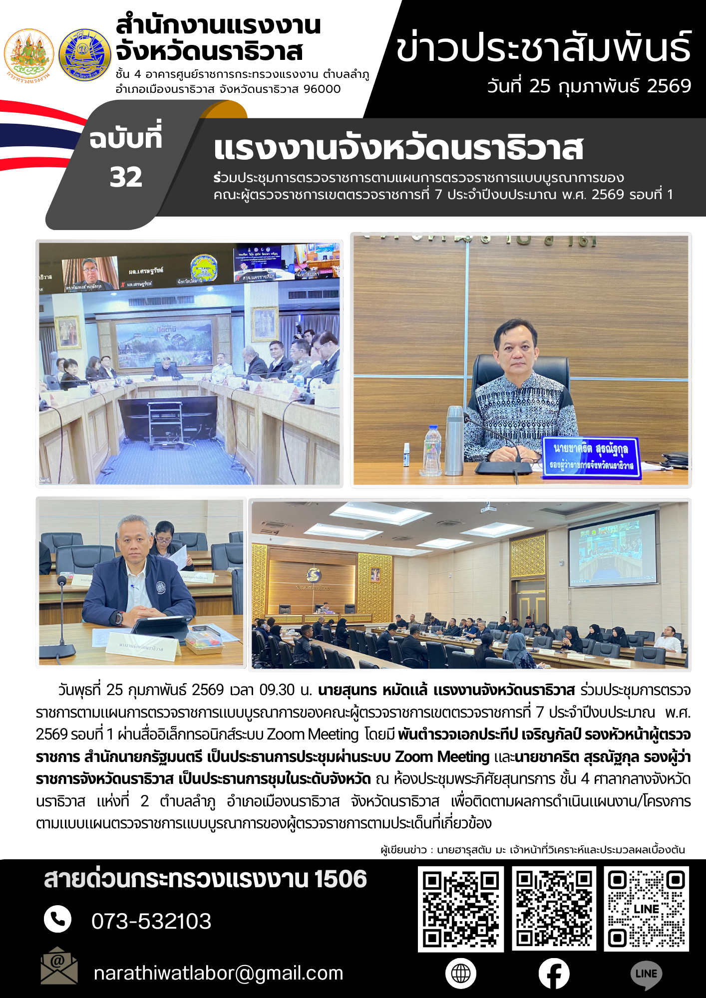 แรงงานจังหวัดนราธิวาส ร่วมประชุมการตรวจราชการตามแผนการตรวจราชการแบบบูรณาการของคณะผู้ตรวจราชการเขตตรวจราชการที่ 7 ประจำปีงบประมาณ พ.ศ. 2569 รอบที่ 1
