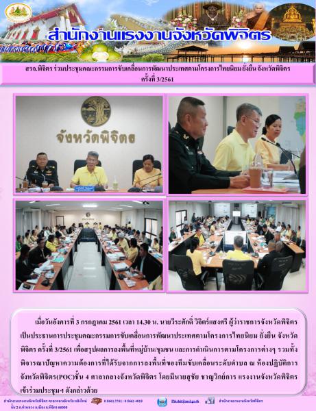 วันอังคารที่ 3 กรกฎาคม 2561 เวลา 14.30 น. นายวีระศักดิ์ วิจิตร์แสงศรี ผู้ว่าราชการจังหวัดพิจิตร เป็นประธานการประชุมคณะกรรมการขับเคลื่อนการพัฒนาประเทศตามโครงการไทยนิยม ยั่งยืน จังหวัดพิจิตร ครั้งที่ 3/2561 เพื่อสรุปผลการลงพื้นที่หมู่บ้าน/ชุมชน และการดำเนินการตามโครงการต่างๆ รวมทั้งพิจารณาปัญหาความต้องการที่ได้รับจากการลงพื้นที่ของทีมขับเคลื่อนระดับตำบล ณ ห้องปฏิบัติการจังหวัดพิจิตร(POC)ชั้น 4 ศาลากลางจังหวัดพิจิตร โดยมีนายสุชัย ชาญวิกย์การ แรงงานจังหวัดพิจิตร เข้าร่วมประชุมฯ ดังกล่าวด้วย