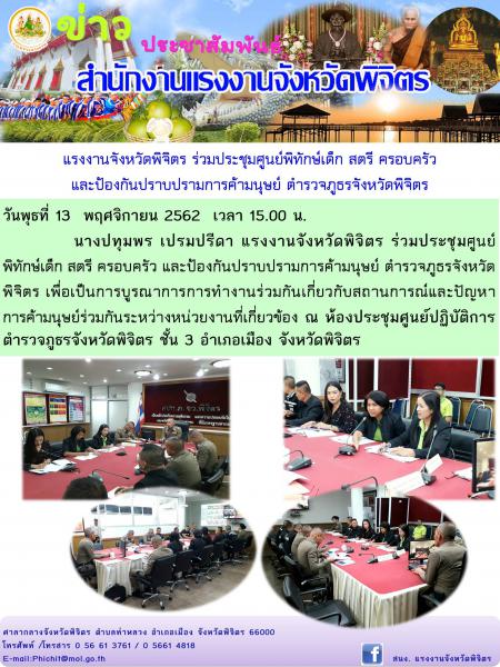 แรงงานจังหวัดพิจิตร ร่วมประชุมศูนย์พิทักษ์เด็ก สตรี ครอบครัว และป้องกันปราบปรามการค้ามนุษย์ ตำรวจภูธรจังหวัดพิจิตร