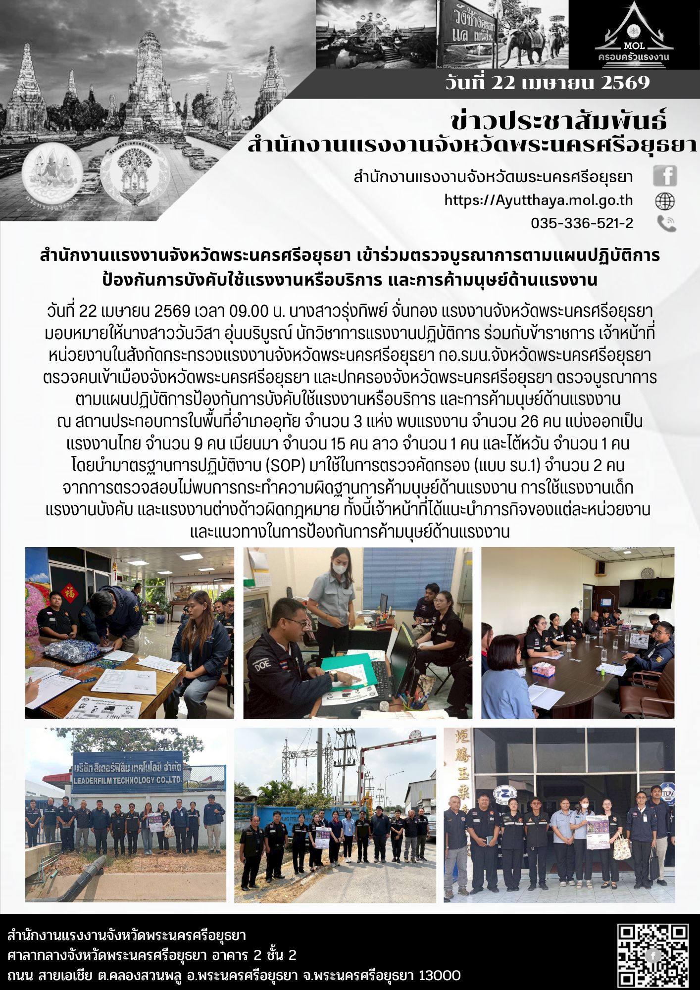 สำนักงานแรงงานจังหวัดพระนครศรีอยุธยา เข้าร่วมตรวจบูรณาการตามแผนปฏิบัติการป้องกันการบังคับใช้แรงงานหรือบริการ และการค้ามนุษย์ด้านแรงงาน