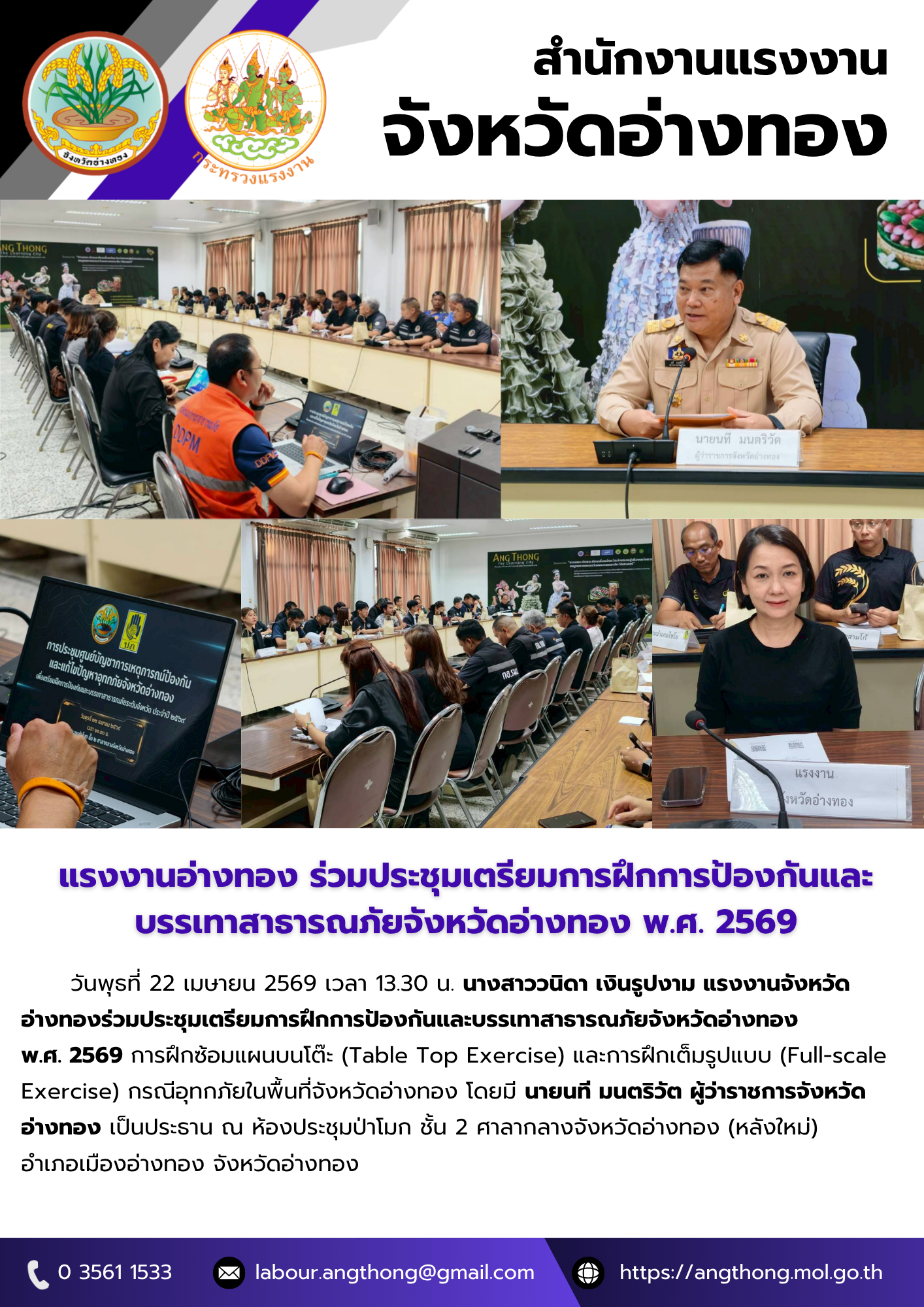 แรงงานอ่างทอง ร่วมประชุมเตรียมการฝึกการป้องกันและบรรเทาสาธารณภัยจังหวัดอ่างทอง พ.ศ. 2569