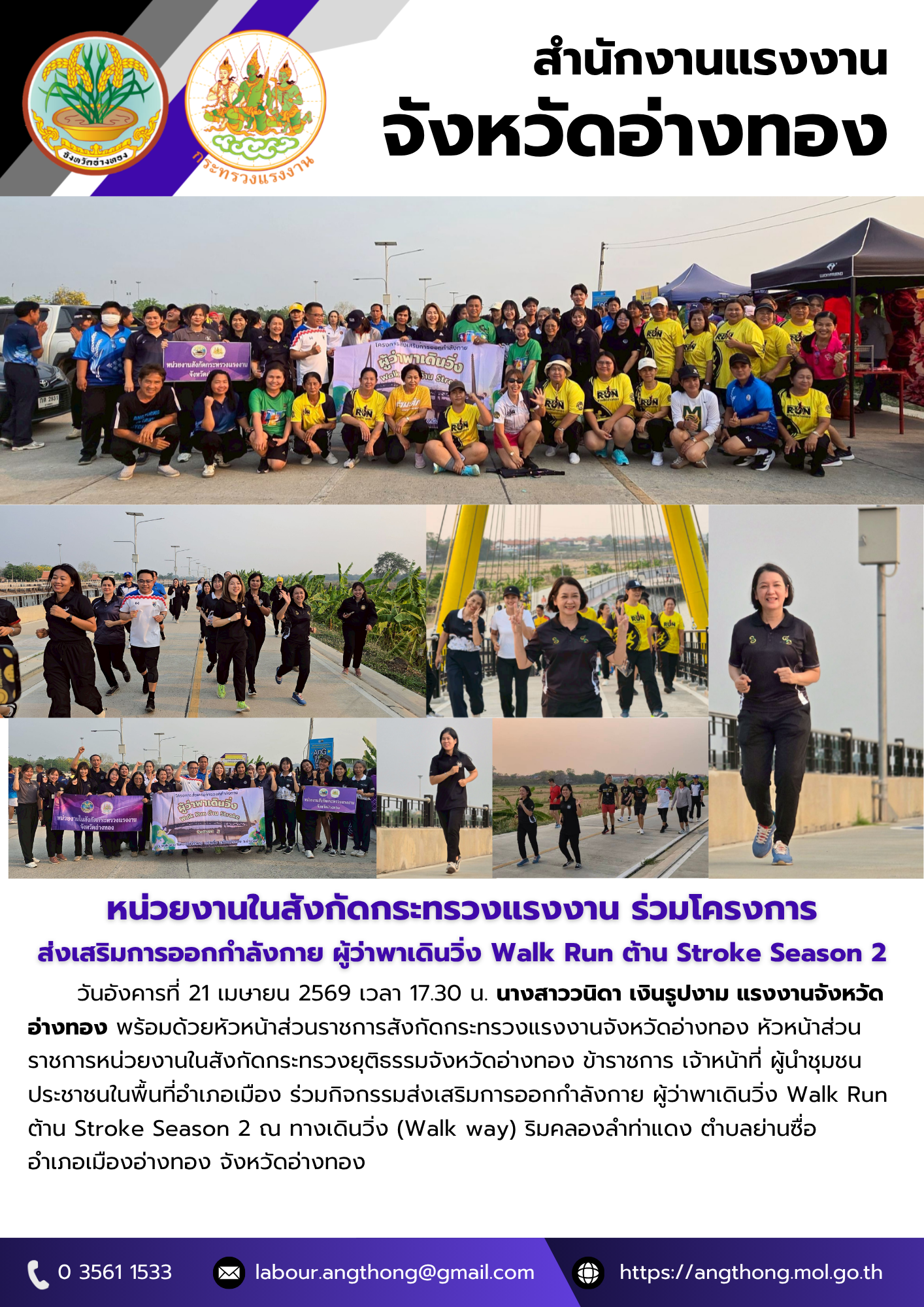 หน่วยงานในสังกัดกระทรวงแรงงาน ร่วมโครงการ ส่งเสริมการออกกำลังกาย ผู้ว่าพาเดินวิ่ง Walk Run ต้าน Stroke Season 2