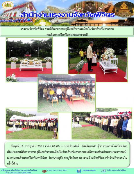 วันพุธที่ 18 กรกฎาคม 2561 เวลา 08.00 น. นายวีระศักดิ์ วิจิตร์แสงศรี ผู้ว่าราชการจังหวัดพิจิตร เป็นประธานพิธีถวายราชสดุดีและกิจกรรมเนื่องในวันคล้ายวันสวรรคตสมเด็จพระศรีนครินทราบรมราชชนนี ณ สวนสมเด็จพระศรีนครินทร์พิจิตร โดยนายสุชัย ชาญวิกย์การ แรงงานจังหวัดพิจิตร เข้าร่วมกิจกรรมในครั้งนี้ด้วย