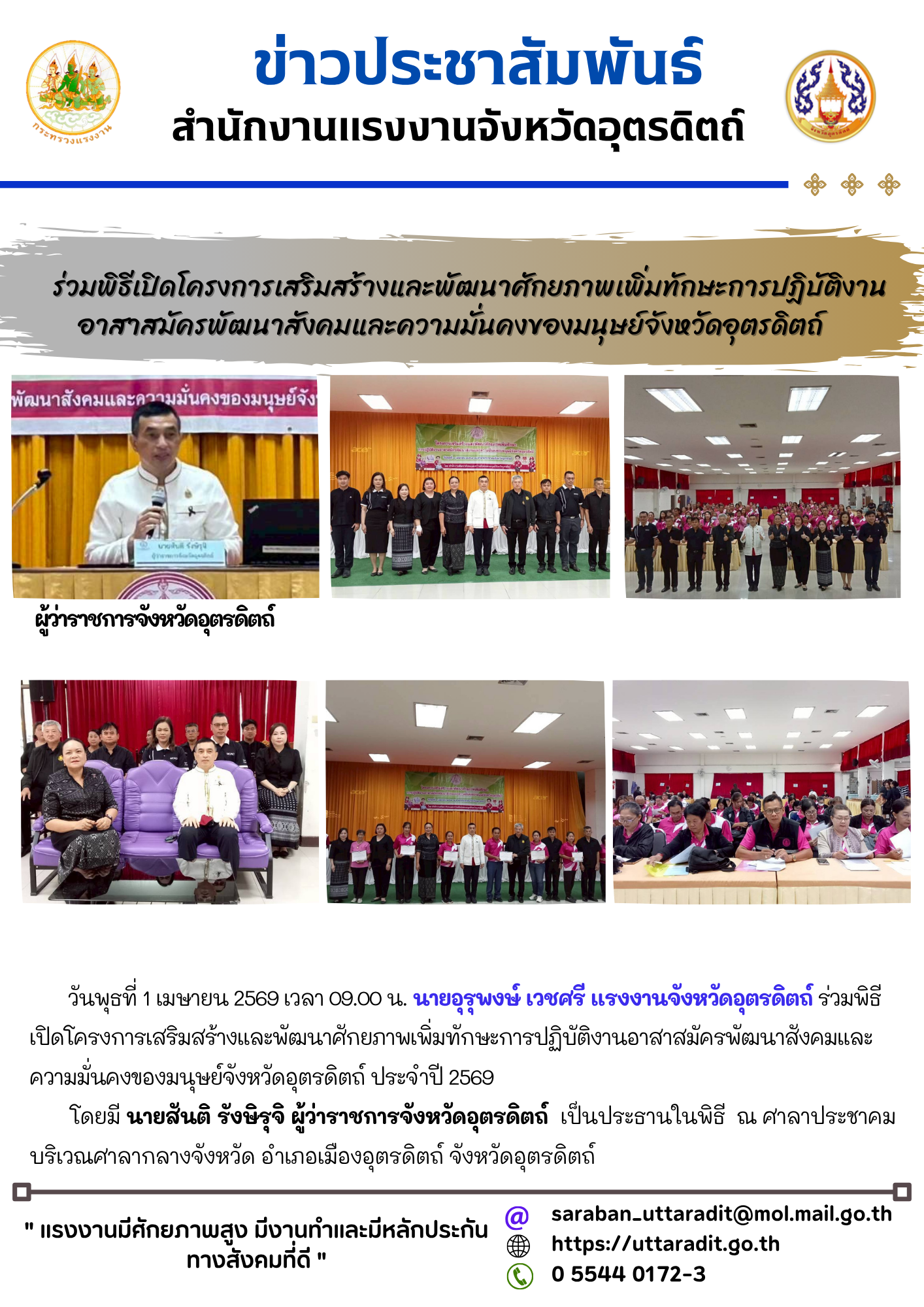 ร่วมพิธีเปิดโครงการเสริมสร้างและพัฒนาศักยภาพเพิ่มทักษะการปฏิบัติงานอาสาสมัครพัฒนาสังคมและความมั่นคงของมนุษย์จังหวัดอุตรดิตถ์