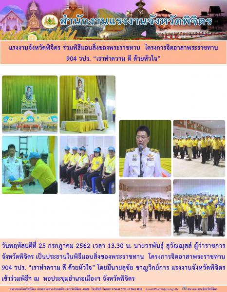 แรงงานจังหวัดพิจิตร ร่วมพิธีมอบสิ่งของพระราชทาน โครงการจิตอาสาพระราชทาน 904 วปร. “เราทำความ ดี ด้วยหัวใจ”