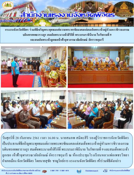 วันศุกร์ที่ 28 กันยายน 2561 เวลา 16.00 น. นายสมภพ สมิตะสิริ รองผู้ว่าราชการจังหวัดพิจิตร เป็นประธานพิธีเจริญพระพุทธมนต์ถวายพระพรชัยมงคลแด่สมเด็จพระเจ้าอยู่หัวมหาวชิราลงกรณ บดินทรเทพยวรางกูร สมเด็จพระนางเจ้าสิริกิติ์ พระบรมราชินีนาถ ในรัชกาลที่ 9 และสมเด็จพระเจ้าลูกเธอ เจ้าฟ้าจุฬาภรณวลัยลักษณ์ อัครราชกุมารี ณ ห้องประชุมโรงเรียนหลวงพ่อเพชรวิทยา อำเภอเมือง จังหวัดพิจิตร โดยนายสุชัย ชาญวิกย์การ แรงงานจังหวัดพิจิตร เข้าร่วมพิธีดังกล่าว
