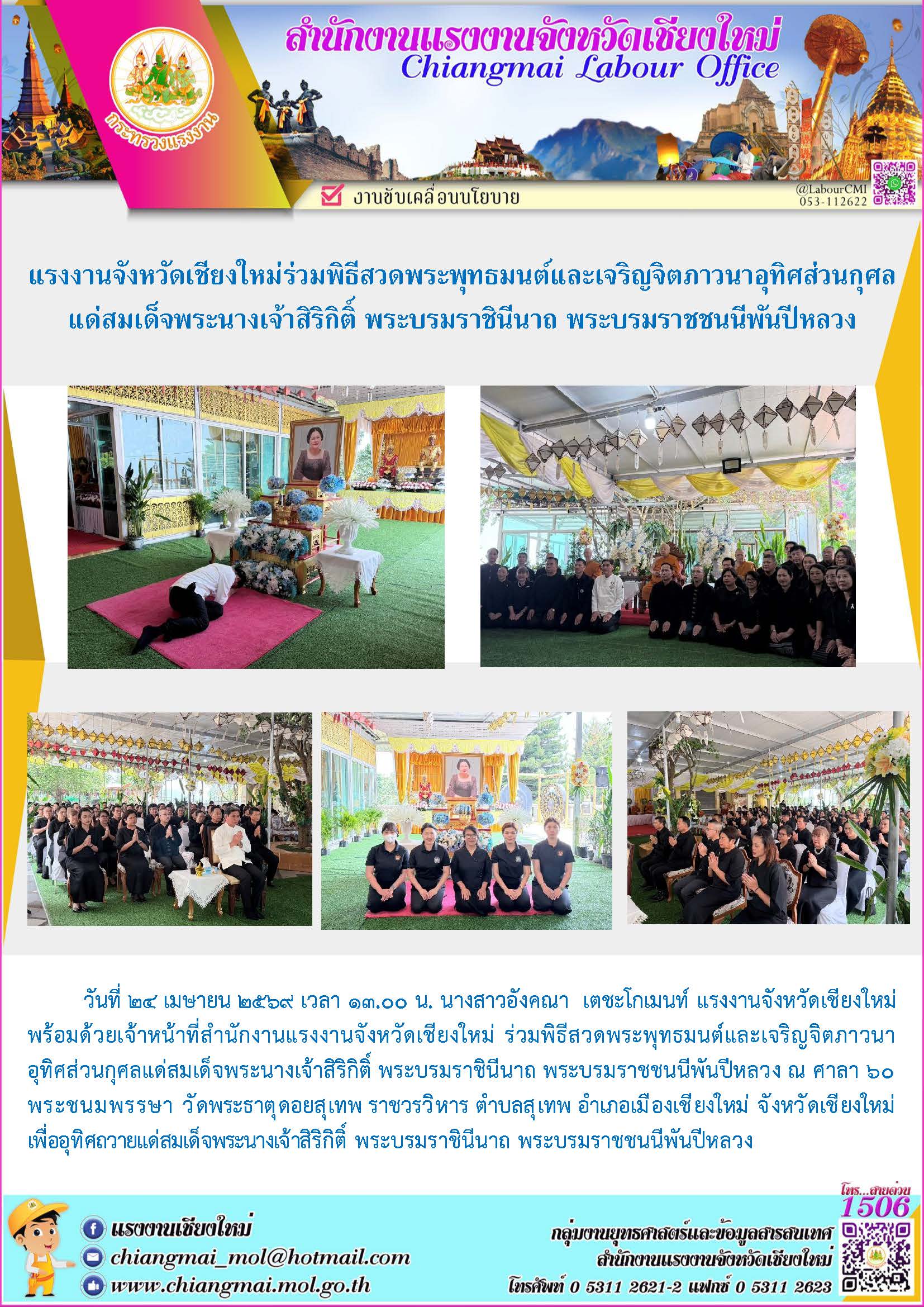 แรงงานเชียงใหม่ ร่วมพิธีสวดพระพุทธมนต์และเจริญจิตภาวนาอุทิศส่วนกุศลแด่สมเด็จพระนางเจ้าสิริกิติ์ พระบรมราชินีนาถ พระบรมราชชนนีพันปีหลวง